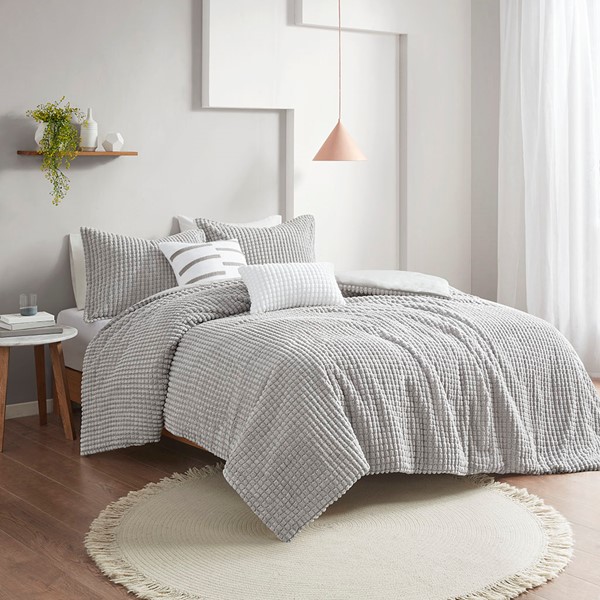 Create a space of pure relaxation and comfort with the Urban Habitat Hayden 5 Piece Plush Clip Jacquard Duvet Cover Set. This solid grey plush clipped jacquard duvet cover features soft dots all over the top of bed, for a unique texture and look. The 2 matching shams pair perfectly with the cozy modern duvet cover, while 1 square and 1 oblong decorative pillow add sophisticated finishing touches. Machine washable for easy care, this modern duvet cover set also uses an antimicrobial treatment that provides built-in freshness protection, reducing the growth of odor causing bacteria to keep fabric lasting longer. A button closure at the foot end secures a padded insert within the duvet cover and inside corner ties prevent it from shifting (insert is NOT included). Items in the set may come in a rolled or compressed packaging, which will need to be fluffed up or steam ironed before use to remove wrinkles.