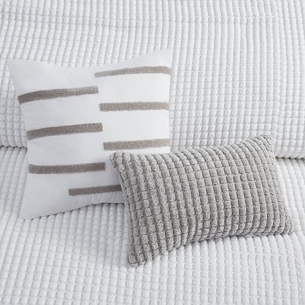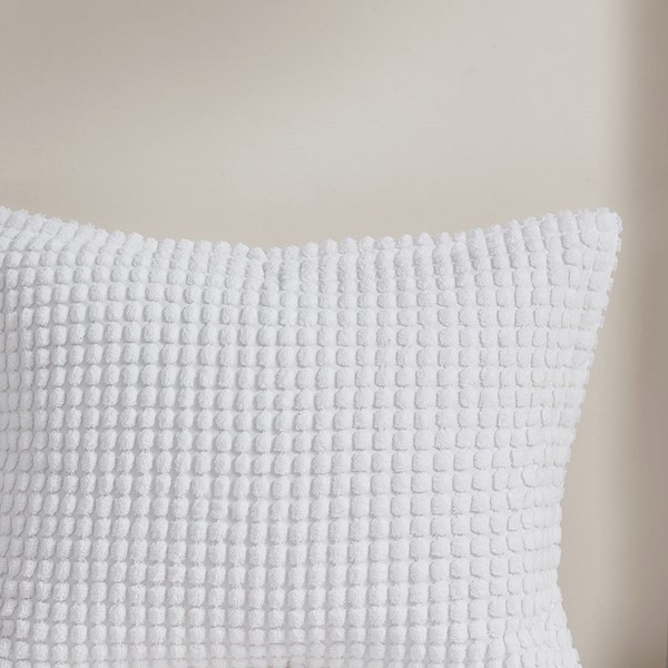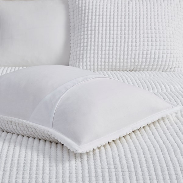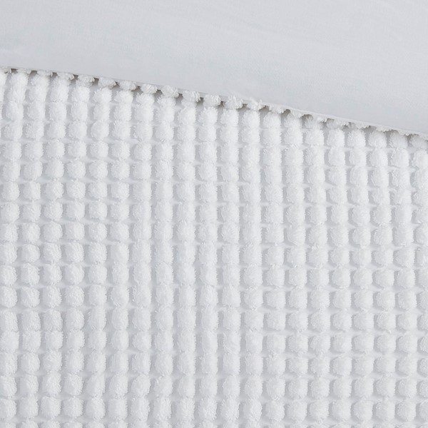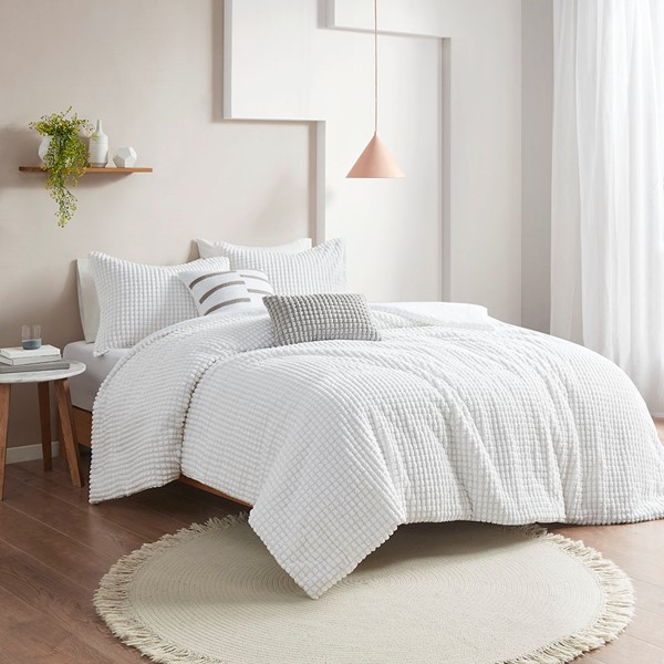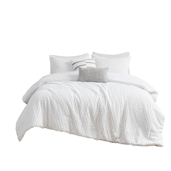 Create a space of pure relaxation and comfort with the Urban Habitat Hayden 5 Piece Plush Clip Jacquard Duvet Cover Set. This solid white plush clipped jacquard duvet cover features soft dots all over the top of bed, for a unique texture and look. The 2 matching shams pair perfectly with the cozy modern duvet cover, while 1 square and 1 oblong decorative pillow add sophisticated finishing touches. Machine washable for easy care, this modern duvet cover set also uses an antimicrobial treatment that provides built-in freshness protection, reducing the growth of odor causing bacteria to keep fabric lasting longer. A button closure at the foot end secures a padded insert within the duvet cover and inside corner ties prevent it from shifting (insert is NOT included). Items in the set may come in a rolled or compressed packaging, which will need to be fluffed up or steam ironed before use to remove wrinkles.