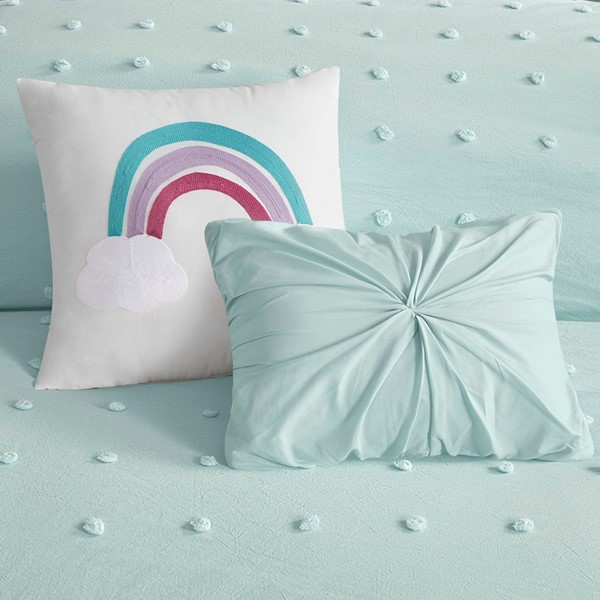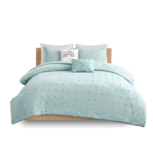 Create a cute and cozy look in your child’s bedroom with the Urban Habitat Kids Callie Cotton Jacquard Pom Pom Comforter Set. This cotton comforter features an all-over jacquard pom pom design that adds texture, for a shabby chic look. Matching shams (1 for Twin Sizes) pair perfectly with the comforter, while a square and an oblong decorative pillow complete this adorable kid’s comforter set. Machine washable, this bedding set is also OEKO-TEX certified, meaning it does not contain any harmful substances or chemicals, and uses an antimicrobial treatment that provides built-in freshness protection, reducing the growth of odor causing bacteria to keep fabric lasting longer.