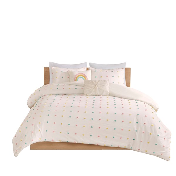 Create a cute and cozy look in your child’s bedroom with the Urban Habitat Kids Callie Cotton Jacquard Pom Pom Duvet Cover Set. This cotton duvet cover features an all-over jacquard pompom design that adds dimension and charm, for a shabby chic look. Matching shams (1 for Twin Sizes) pair perfectly with the duvet cover, while a square and an oblong decorative pillow complete the adorable kid’s duvet cover set. Machine washable, this bedding set is also OEKO-TEX certified, meaning it does not contain any harmful substances or chemicals, and uses an antimicrobial treatment that provides built-in freshness protection, reducing the growth of odor causing bacteria to keep fabric lasting longer. Button closures allow you to place a comforter insert within the duvet cover and internal corner ties help prevent it from shifting (Insert is NOT included).