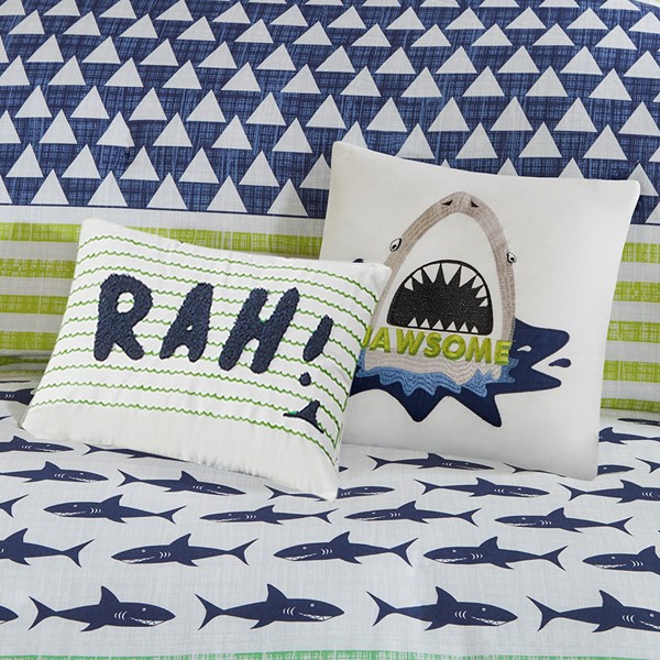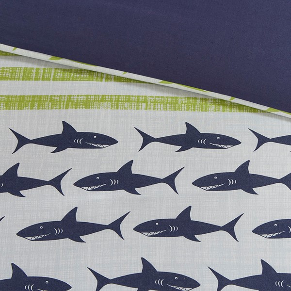 The Urban Habitat Kids Finn Duvet Cover Set provides a fiercely fun update to your child’s bedroom. The 100% cotton duvet cover sports a shark and stripe print in navy and green colors that pops on the light grey background. A solid navy reverse adds a bold splash of color, while coordinating shams (1 for Twin Sizes) complete the look. Two decorative pillows with embroidered details provide the finishing touches to the duvet cover set. Machine washable for easy care, this "Jawesome" duvet cover set is sure to make a splash in your bedroom. This bedding set is OEKO-TEX certified, meaning it does not contain any harmful substances or chemicals, and uses an antimicrobial treatment that provides built-in freshness protection, reducing the growth of odor causing bacteria to keep fabric lasting longer. A button closure allows you to place a comforter insert within the duvet cover and internal corner ties prevent it from shifting.