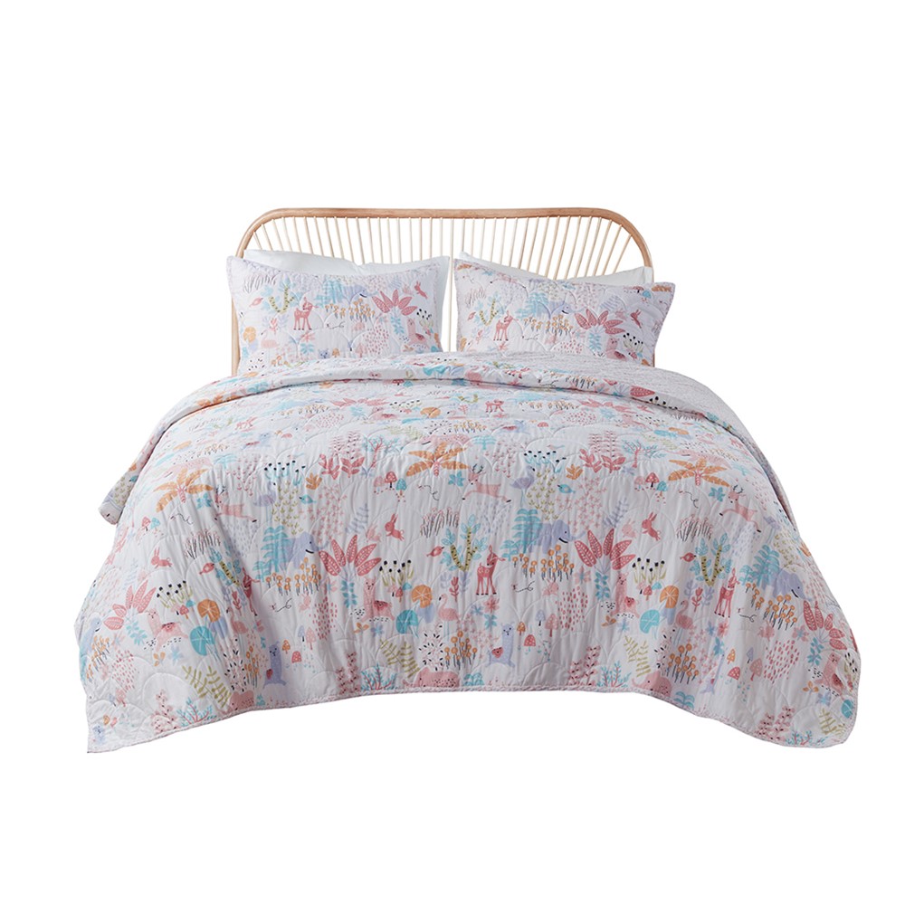 The Urban Habitat Kids Iris Quilt features a woodland print that will let your kid cuddle up with their favorite animal friends. This cotton quilt set brings a fun update to your kid’s bedroom with its cute print of woodland creatures in a forest and a ditsy floral pattern on the reverse. The 2 matching shams (1 in Twin) repeat the pattern of the woodland animals to create an adorable and whimsical look. Cotton filling, in the quilt, provides maximum comfort and the prewashed fabric helps avoid further shrinkage. Machine washable for easy care, this quilt set is also OEKO-TEX certified, featuring an antimicrobial treatment, which keeps the bedding fresher longer.