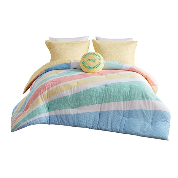 Add a burst of color to your kid’s room with the Urban Habitat Kids Rory Rainbow Sunburst Reversible Cotton Comforter Set. This cotton comforter features a colorful sunburst pattern with a confetti print on the reverse, for a fun and cheerful look. The 2 shams (1 in Twin) coordinate with the bright colors of the reversible comforter to spread sunshine throughout your child’s bed. A round decorative pillow adds an adorable finishing touch. An antimicrobial treatment provides built-in freshness protection, reducing the growth of odor causing bacteria to keep fabric lasting longer. This kid’s rainbow bedding set is also OEKO-TEX certified, meaning it does not contain any harmful substances or chemicals to ensure quality comfort. Items in the set may come in a rolled or compressed packaging, which will need to be fluffed up or steam ironed before use to remove wrinkles.