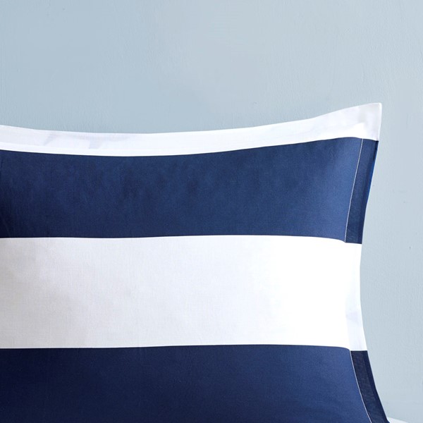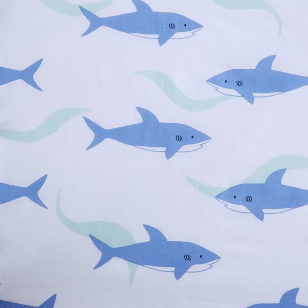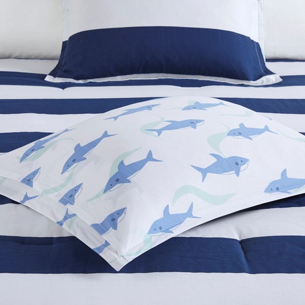 Add a bright and playful update to your kid’s bedroom with the Urban Habitat Kids Sammie Cotton Cabana Stripe Reversible Comforter Set. This soft cotton comforter and 2 shams (1 in Twin) features a classic navy and white cabana stripe with a cool shark print on the reverse, for a fun new look. Hypoallergenic polyester filling in the comforter contains no allergens and is treated to be dustproof, and provides exceptional warmth for a restful night’s sleep. Machine washable for easy care, this kid’s cotton bedding set is also OEKO-TEX certified, meaning it does not contain any harmful substances or chemicals to ensure quality comfort. Bedding may come in rolled or compressed packing and will need to be fluffed up. Use a steam iron to help remove wrinkles easier.