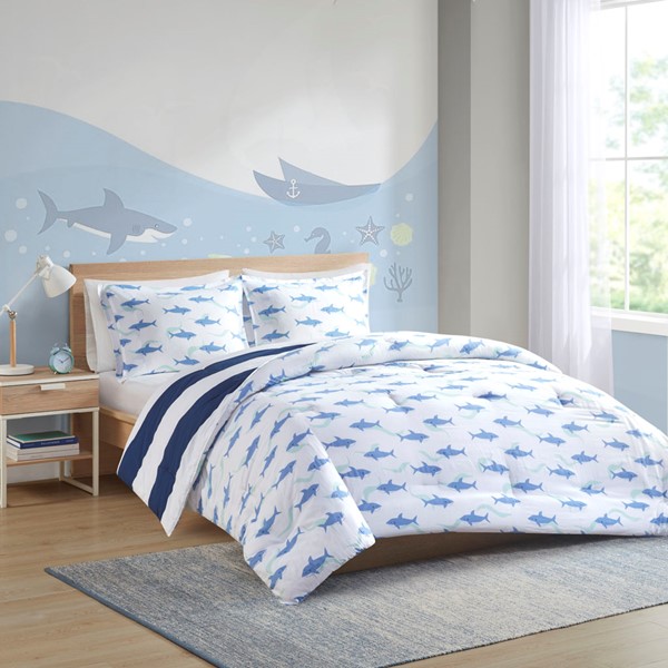 Add a bright and playful update to your kid’s bedroom with the Urban Habitat Kids Sammie Cotton Cabana Stripe Reversible Comforter Set. This soft cotton comforter and 2 shams (1 in Twin) features a classic navy and white cabana stripe with a cool shark print on the reverse, for a fun new look. Hypoallergenic polyester filling in the comforter contains no allergens and is treated to be dustproof, and provides exceptional warmth for a restful night’s sleep. Machine washable for easy care, this kid’s cotton bedding set is also OEKO-TEX certified, meaning it does not contain any harmful substances or chemicals to ensure quality comfort. Bedding may come in rolled or compressed packing and will need to be fluffed up. Use a steam iron to help remove wrinkles easier.