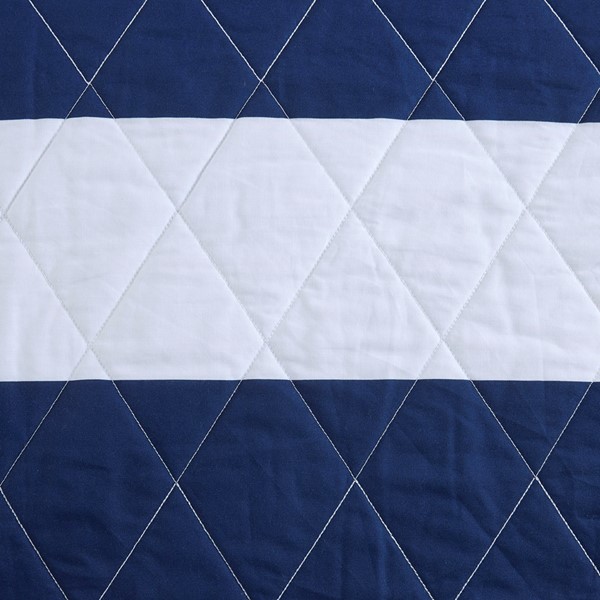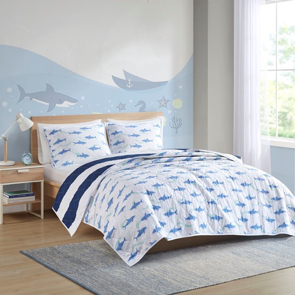 Add a bright and playful update to your kid’s bedroom with the Urban Habitat Kids Sammie Cotton Cabana Stripe Reversible Quilt Set. This soft cotton quilt and 2 shams (1 in Twin) features a classic navy and white cabana stripe with a cool shark print on the reverse, for a fun new look. Cotton filling, in the quilt, provides maximum comfort and the prewashed fabric helps avoid further shrinkage. Machine washable for easy care, this kid’s cotton bedding set is also OEKO-TEX certified, meaning it does not contain any harmful substances or chemicals to ensure quality comfort.