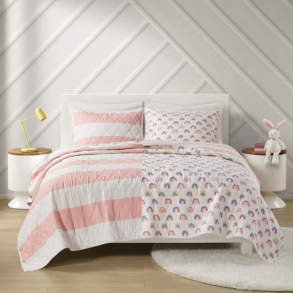 Add a bright and playful update to your kid’s bedroom with the Urban Habitat Kids Sammie Cotton Cabana Stripe Reversible Quilt Set. This soft cotton quilt and 2 shams (1 in Twin) features a classic pink and white cabana stripe with a colorful rainbow print on the reverse, for a fun new look. Cotton filling, in the quilt, provides maximum comfort and the prewashed fabric helps avoid further shrinkage. Machine washable for easy care, this kid’s cotton bedding set is also OEKO-TEX certified, meaning it does not contain any harmful substances or chemicals to ensure quality comfort.