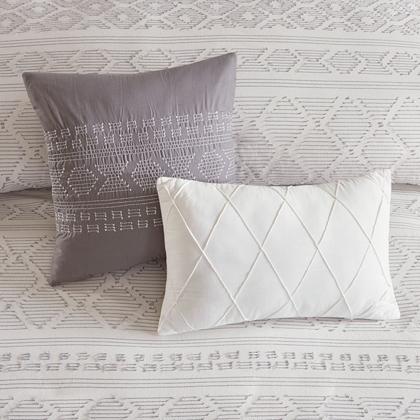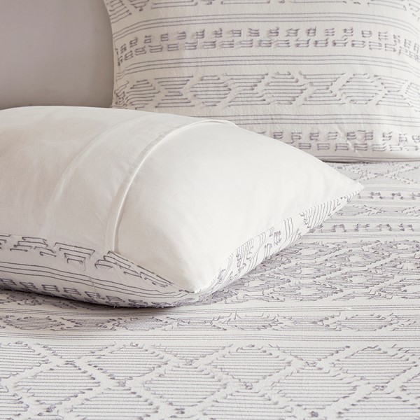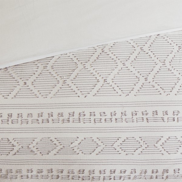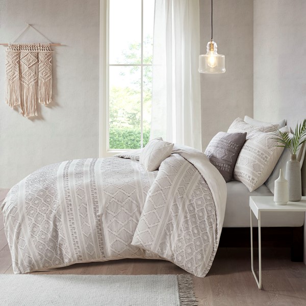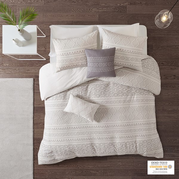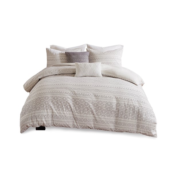 The Urban Habitat Lizbeth 5 Piece Cotton Clip Jacquard Duvet Cover Set offers a unique modern update to your bedroom. The duvet cover features clip jacquard geometric patterns, on the cotton fabric base to create a chic contemporary look. Matching shams coordinate with the top of the duvet cover, while a square and an oblong decorative pillow adds the finishing touches to the clip jacquard comforter set. This bedding set is also OEKO-TEX certified, meaning it does not contain any harmful substances or chemicals to ensure quality comfort and wellness. Button closures on the duvet cover secure a padded insert (NOT included) within the duvet cover and internal corner ties prevent it from shifting.