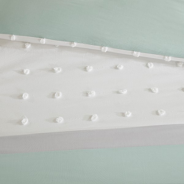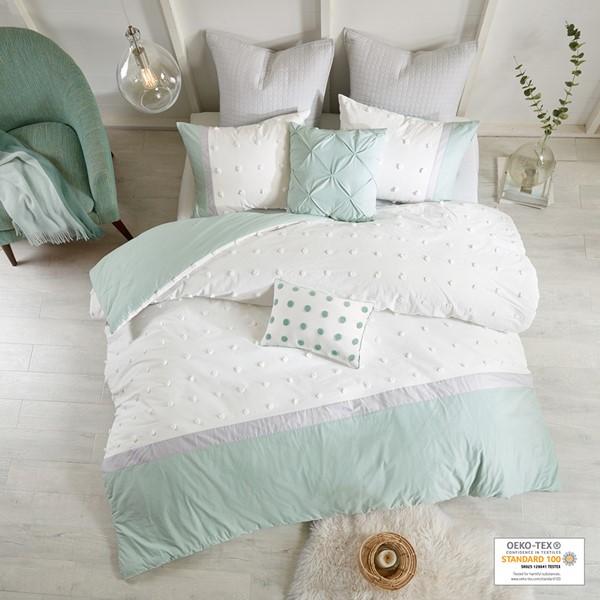 Stylish and comfortable, the Urban Habitat Myla 7 Piece Cotton Jacquard Comforter Set is the perfect update for your bedroom. The 100% cotton comforter showcases a pieced design in ivory, grey, and seafoam hues accented by jacquard tufted dots with a solid seafoam reverse. Matching shams coordinate beautifully with the top of the comforter, while quilted Euro shams add extra dimension to the bed. Completing the comforter set are two decorative pillows with fabric manipulation and embroidered details. This bedding set is also OEKO-TEX certified, meaning it does not contain any harmful substances or chemicals to ensure quality comfort and wellness.