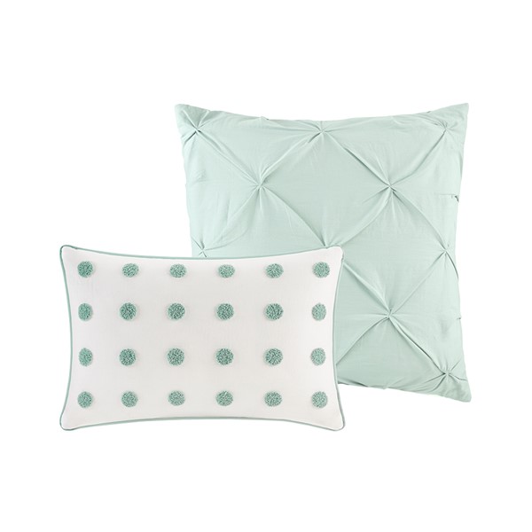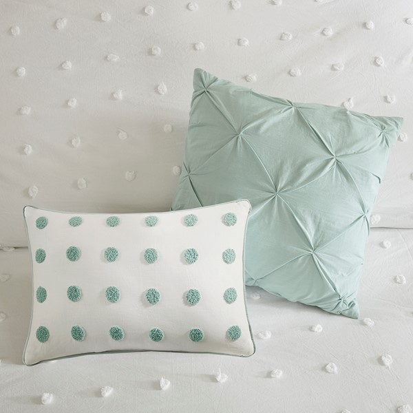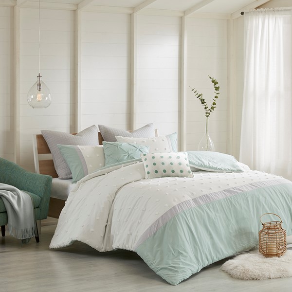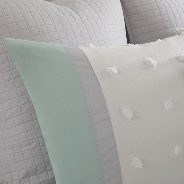 Stylish and comfortable, the Urban Habitat Myla 7 Piece Cotton Jacquard Duvet Cover Set is the perfect update for your bedroom. The 100% cotton duvet cover and shams showcase a pieced design in ivory, grey, and seafoam hues accented by jacquard tufted dots with a solid seafoam reverse. Two quilted Euro shams add extra dimension to the bed, while two decorative pillows add the finishing touches. This bedding set is also OEKO-TEX certified, meaning it does not contain any harmful substances or chemicals to ensure quality comfort and wellness. Button closures on the duvet cover secure a padded insert (NOT included) within the duvet cover and internal corner ties prevent it from shifting.