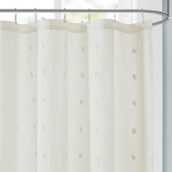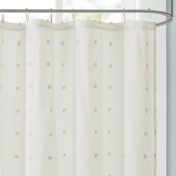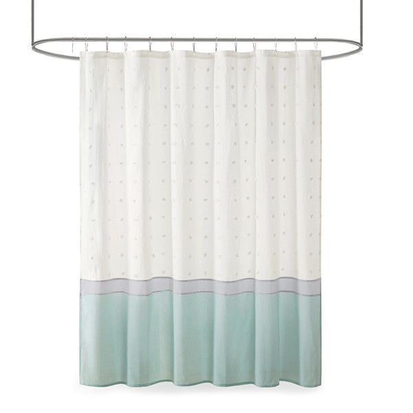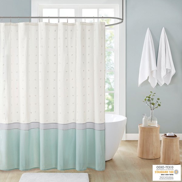 Freshen up your bathroom decor with our Urban Habitat Myla Cotton Jacquard Shower Curtain. This 100% cotton shower curtain features tufted clipped dots for a fun and rich texture, while a pieced solid seafoam and grey stripe bottom border provides a colorful touch for the perfect stylish, shabby chic update. Machine washable for easy care; this shower curtain is also OEKO-TEX certified, meaning it does not contain any harmful substances or chemicals to ensure quality comfort and wellness. Each shower curtain measures 72"x72" and is finished with 12 button holes at the top making it easy to hang – hooks/rod/water repellant liner are not included and will need to be purchased separately. Complete the look with coordinating bedding also available and sold separately.