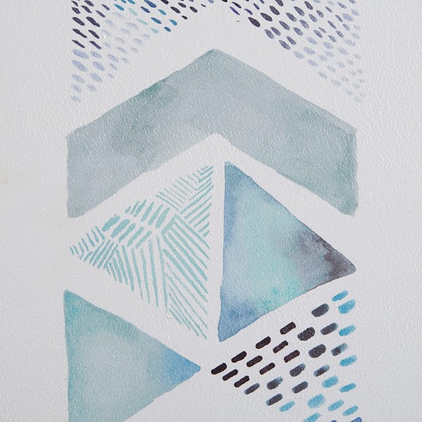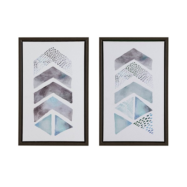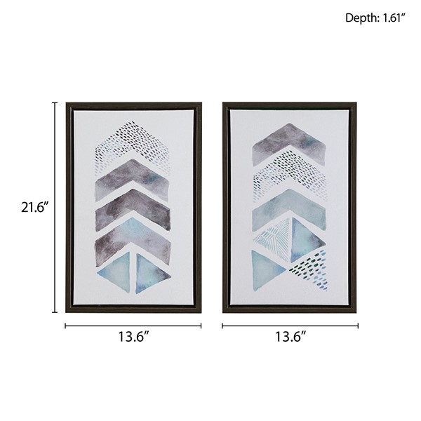 Accent your space with the Urban Habitat This and That Way Abstract 2-piece Framed Canvas Wall Art Set by Artist Aubrey. Each canvas displays a geometric design in blue and grey hues on a crisp white ground for a modern look; while the gel coating provides a glossy finish and the black frame creates a clean edge and update. With 2 D-rings on the reverse of each piece for easy hanging, this framed wall art set provides a fun and modern touch to any room. Spot clean only and comes as a 2 piece set, with each piece measuring 13.6×21.6."