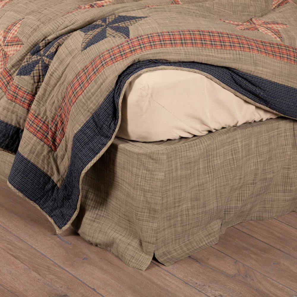 Complete the look of your bed with our all-cotton Vincent King Bed Skirt 78x80x16, featuring a box pleated striated khaki green fabric with a 16 inch drop and split corners to fit any bed frame. This rustic bed skirt will make a great addition to your existing country, primitive decor and add a delightful finishing touch to your bed.