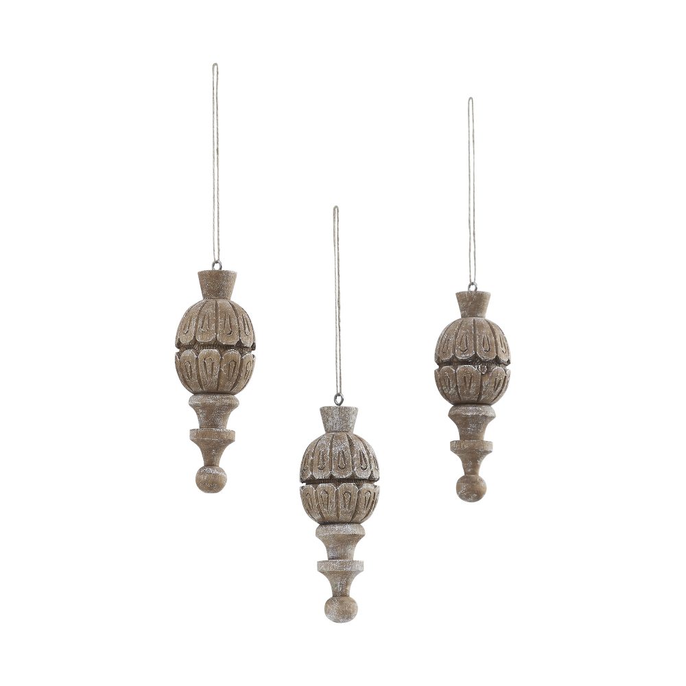 Add timeless character to your holiday decor with the VHC Brands Vintage Ornament Feathered Finish Set of 3. Crafted from tropical wood, these oval-shaped ornaments feature a natural wood brown and white finish with sculpted contours and carved details that evoke a charming Old World aesthetic. The distressed appearance and feathered finish lend a rustic, handcrafted touch, perfect for vintage or primitive holiday themes. Each ornament in the set is uniquely carved, bringing texture and visual interest to your Christmas tree, garlands, or seasonal displays. The soft contrast of wood brown and white tones adds warmth and elegance, while the solid color palette ensures easy coordination with other holiday decor. Their sturdy construction and natural materials create a sense of tradition and authenticity. Ideal for use in the bathroom, bedroom, dining room, entryway, kitchen, or living room, this set of three ornaments offers versatile styling throughout your home. Whether grouped together or displayed separately, the VHC Brands Vintage Ornament Feathered Finish Set brings a touch of nostalgic charm and rustic refinement to your Christmas collection. To preserve their beauty, simply wipe clean with a soft cloth.