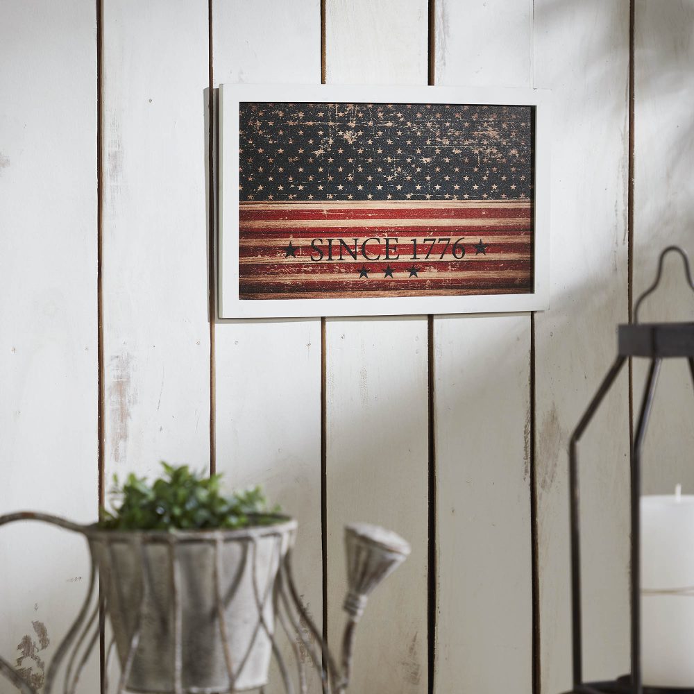 Celebrate your love for American heritage with the VHC Brands Patriotic Vintage USA Flag Since 1776 MDF Wall Hanging 10x16. This decorative sign features a beautifully distressed stars-and-stripes design in navy blue, deep red, and tan, accented with star details and the text "Since 1776" to commemorate the birth of the nation. A white frame completes the rustic, vintage-inspired look, making it a perfect centerpiece for your Fourth of July decor or a timeless year-round tribute to American pride. Designed for versatile display, this rectangular wall hanging enhances the charm of living rooms, dining rooms, kitchens, bedrooms, bathrooms, or entryways. The distressed finish and classic Americana color palette make it ideal for rustic, farmhouse, and country-inspired interiors, adding depth and character to your space. With pre-drilled holes, the sign can be easily hung on walls or placed on mantels, shelves, or countertops for a standing display option. Caring for the VHC Brands Patriotic Vintage USA Flag Since 1776 Wall Hanging is simple-just wipe it clean with a soft cloth to maintain its distressed digital print and vibrant colors. Whether displayed as a standalone statement piece or paired with other patriotic accents, this sign combines quality craftsmanship, timeless design, and heartfelt sentiment. Celebrate the enduring spirit of freedom and independence with this rustic addition to your home decor.