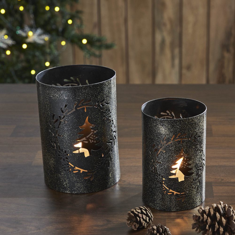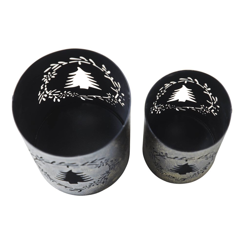 Elevate your winter and Christmas decor with the charming VHC Brands Metal Votive Candle Holder Christmas Tree Wreath Set of 2, designed to infuse your kitchen, dining table, or shelves with festive flair. Crafted from durable metal, these candle holders feature intricate cutout designs of Christmas trees and wreaths, offered in two sizes: 7x4.75x4.75 inches and 5.9x3.9x3.9 inches. The whimsical silhouettes of the Christmas tree and wreath add a touch of holiday magic to your indoor spaces, making them ideal for creating a warm and inviting ambiance during the holiday season. Finished in a faded black hue, these candle holders boast a rustic and primitive aesthetic that exudes vintage charm. Their distressed appearance adds character and depth to any room, evoking the cozy nostalgia of classic Christmas celebrations. Whether placed in the dining room, entryway, or living room, these candle holders effortlessly complement your winter decor, serving as eye-catching accents that enhance the festive atmosphere of your home.While enjoying the soft glow of candlelight emitted by these holders, it's essential to prioritize safety. Remember to exercise caution and refrain from touching or moving the holders while warm or when candles are lit. Always allow the candle holders to cool down before handling, and ensure they are kept out of reach of children. Additionally, take care to place lit candles away from flammable objects, ensuring a secure and joyful environment for your winter and Christmas festivities.