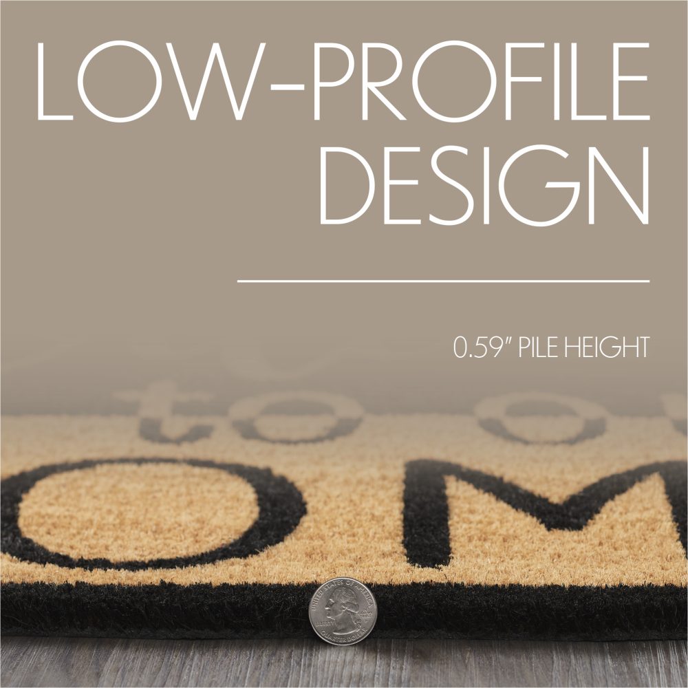 Welcome guests with rustic charm using the VHC Brands Welcome To Our Home Black Tan Coir Welcome Rug Half Circle 16.5x33. This stylish doormat features the warm message Welcome to our Home in stenciled text, set against a striking contrast of deep black on the upper portion and natural tan on the lower portion. The half-circle design adds a unique and inviting touch, making it perfect for any entryway or porch with a rustic or country homestead vibe. Made from durable coir, this rug is designed to trap dirt and debris while adding a welcoming aesthetic to your home. Its non-slip PVC backing ensures the rug stays securely in place, offering both safety and stability, especially in high-traffic areas. The bold contrast of colors and simple yet inviting text make it an excellent addition to any farmhouse or primitive-style decor, creating a warm and inviting atmosphere for visitors. For easy maintenance, simply shake or vacuum to remove surface dirt. To maintain the bright colors and prolong its life, keep the VHC Brands Welcome To Our Home Coir Welcome Rug in a sheltered entryway. Whether you're looking to enhance your front porch or add a cozy, country-inspired accent to your home, this rug offers both functionality and rustic elegance, making it a perfect addition to any welcoming space.