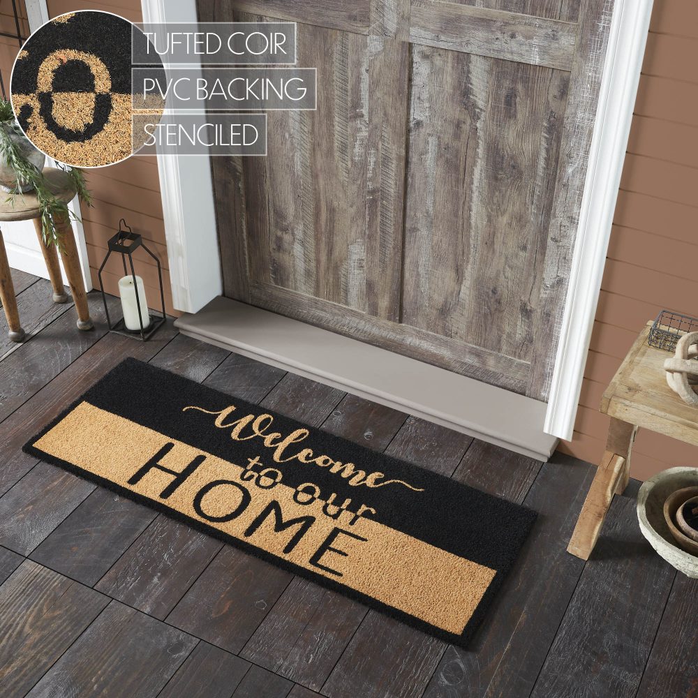 Welcome guests with the rustic elegance of the VHC Brands Welcome To Our Home Black Tan Coir Welcome Rug Rect 17x48. This striking doormat features the inviting phrase "Welcome to our Home" displayed prominently against a backdrop of solid deep black on the upper portion, contrasted by a natural tan lower portion. This eye-catching design adds a warm touch to any entryway, making it perfect for country homesteads and rustic decor. Crafted from durable coir, this rug is designed to trap dirt and debris effectively, helping to keep your home clean while providing a stylish accent. Its rectangular shape fits seamlessly at your doorstep, and the non-slip PVC backing ensures that the mat stays securely in place, providing stability and safety for all who enter. The bold contrast of colors enhances its visual appeal, creating a welcoming atmosphere for family and friends. For easy maintenance, simply shake or vacuum the rug to remove surface dirt. To preserve its vibrant colors and extend its lifespan, it's best to keep the VHC Brands Welcome To Our Home Coir Welcome Rug in a sheltered entryway. Combining practicality with charming design, this rug is a must-have addition to any home looking to greet visitors with warmth and style.