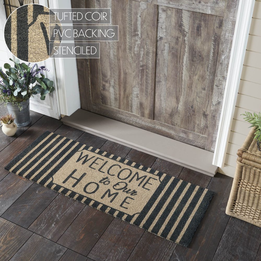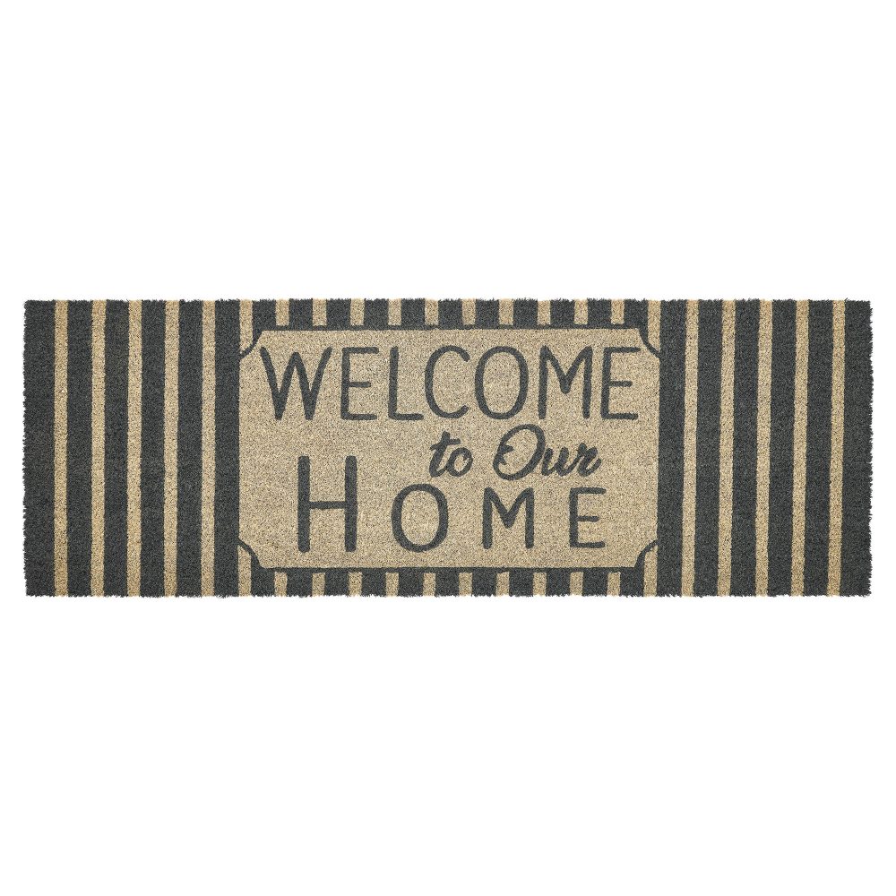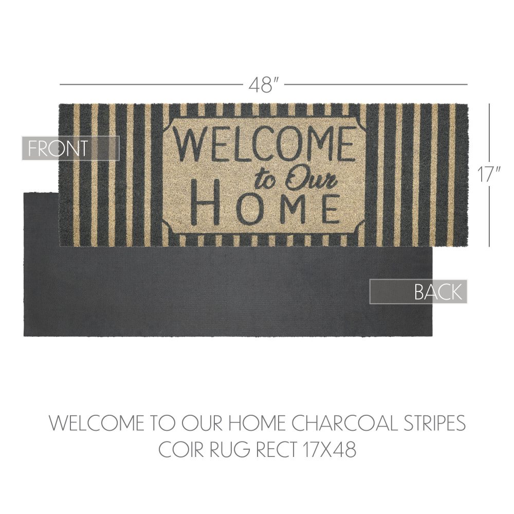Welcome guests with the charming appeal of the VHC Brands Welcome To Our Home Charcoal Stripes Coir Welcome Rug Rect 17x48. This stylish doormat features the inviting phrase "Welcome to Our Home" prominently displayed against a classic dark grey and creme striped background. Its sophisticated design adds a touch of rustic elegance, making it a perfect addition to any country-style entryway. Crafted from durable coir, this rug is designed to trap dirt and debris effectively, helping to keep your home clean and welcoming. The rectangular shape fits seamlessly at your doorstep, while the non-slip PVC backing ensures stability, keeping the rug securely in place even in high-traffic areas. The combination of classic stripes and a heartfelt message creates a warm atmosphere that welcomes family and friends. For easy maintenance, simply shake or vacuum the rug to remove surface dirt. To prolong its vibrant colors and extend its life, it's best to keep the VHC Brands Welcome To Our Home Charcoal Stripes Coir Welcome Rug in a sheltered entryway. This rug beautifully combines practicality with style, making it an essential piece for any home looking to create a warm and inviting entrance.