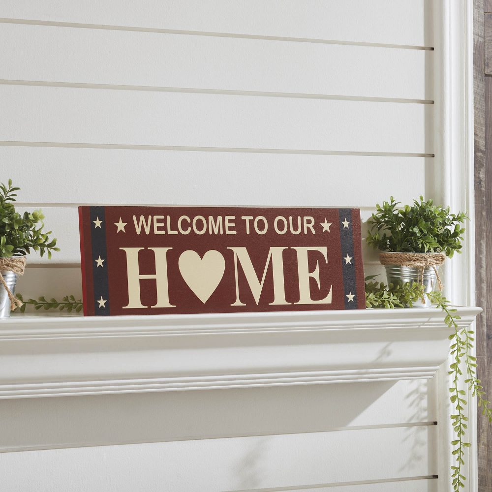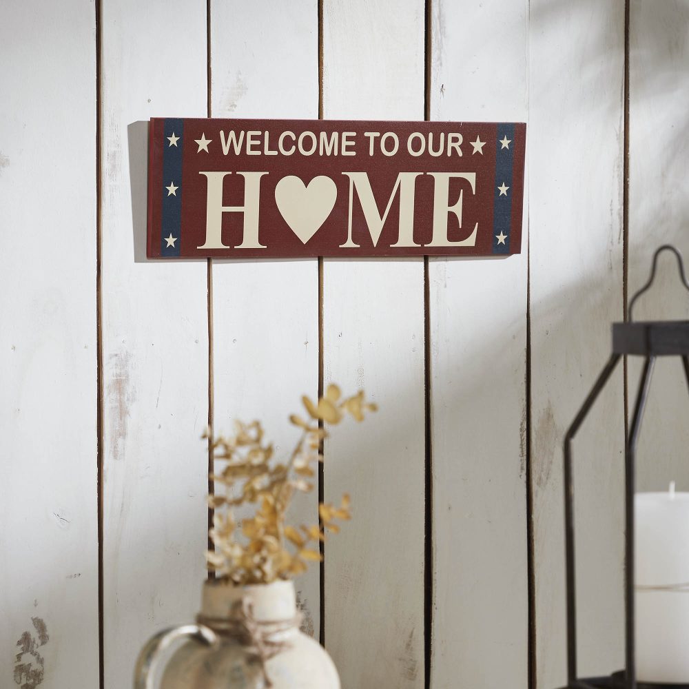 Create a warm and patriotic welcome with the VHC Brands Patriotic Welcome To Our Home w/ Stars On Blue Stripes MDF Wall Sign 6x18. This charming decorative sign features the phrase "Welcome To Our Home" in creme, with a heart symbol replacing the "O" in "Home," adding a heartfelt touch. The deep burgundy background is accented with navy blue star trim, offering a classic Americana aesthetic with a rustic, distressed finish. Perfect for any room, this rectangular wall sign adds charm and character to living rooms, dining rooms, kitchens, bedrooms, bathrooms, or entryways. Its patriotic color palette of burgundy, navy blue, and creme complements rustic farmhouse and country-style interiors, making it an ideal addition to Independence Day decor or year-round displays. Whether hung on a wall or propped on a shelf, this sign provides a welcoming, timeless accent. Maintaining the VHC Brands Patriotic Welcome To Our Home Wall Sign is effortless-simply wipe it clean with a soft cloth to preserve its vibrant digital print and distressed appearance. Whether used as a standalone piece or paired with other patriotic decorations, this wall sign combines quality craftsmanship and heartfelt design. It's the perfect way to honor your love for home and country while enhancing your rustic farmhouse decor.