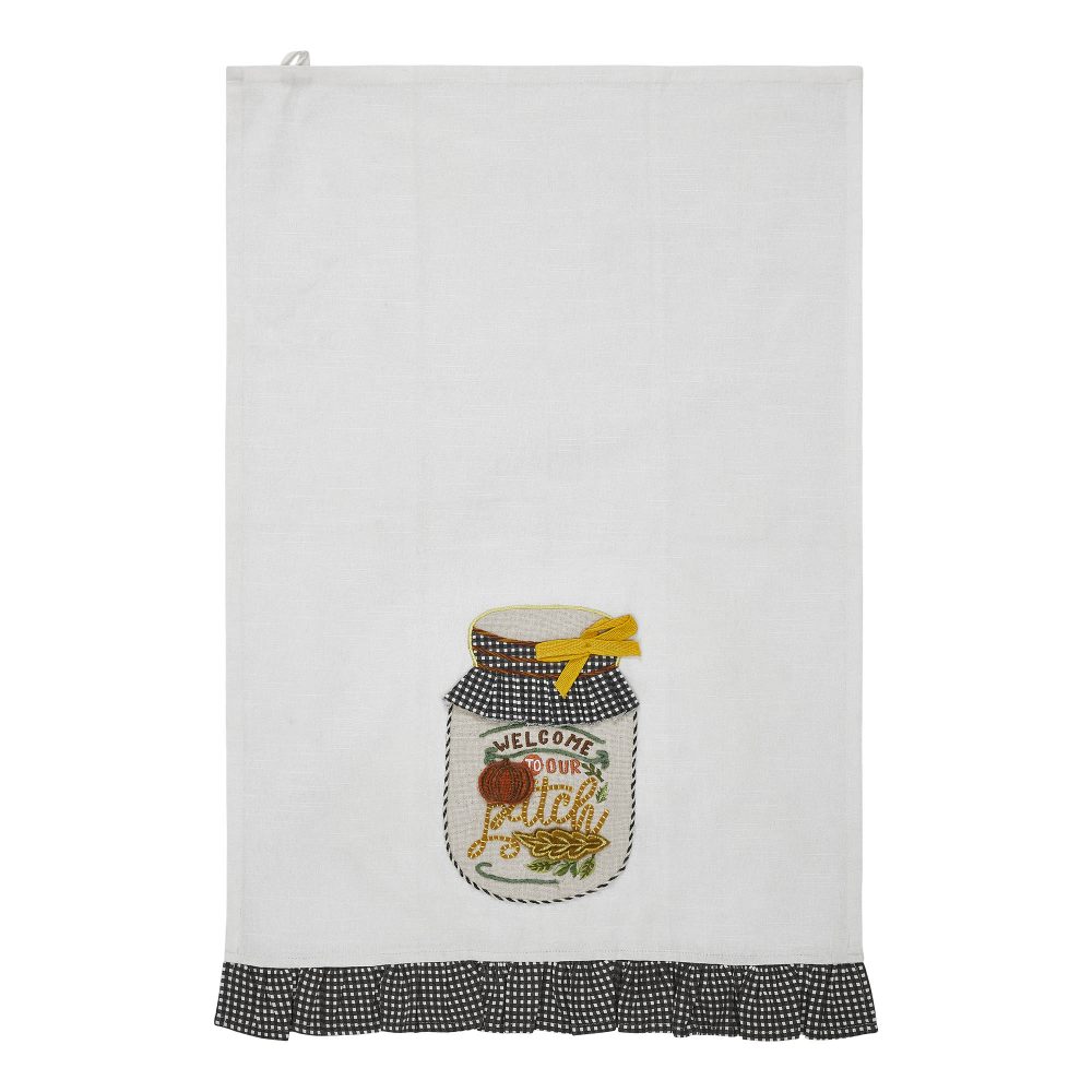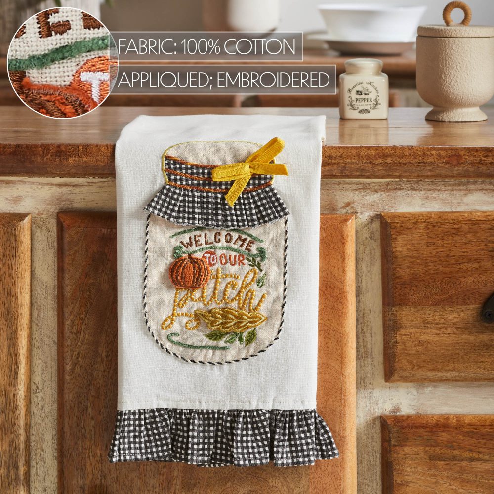 - FESTIVE FALL DESIGN & PREMIUM QUALITY: Elevate your kitchen with the VHC Brands Welcome to Our Patch Tea Towel, a generous 19×28 inch absorbent cotton piece featuring exquisite 9.25×5.73 inch embroidery of “Welcome to Our Patch” within a timeless mason jar design, accented with a sweet bow and country black and soft pale yellow stitching on a crisp white background. This machine-washable decorative dish towel perfectly blends rustic farmhouse charm with practical utility, ideal for your autumn harvest gatherings and everyday fall culinary needs.