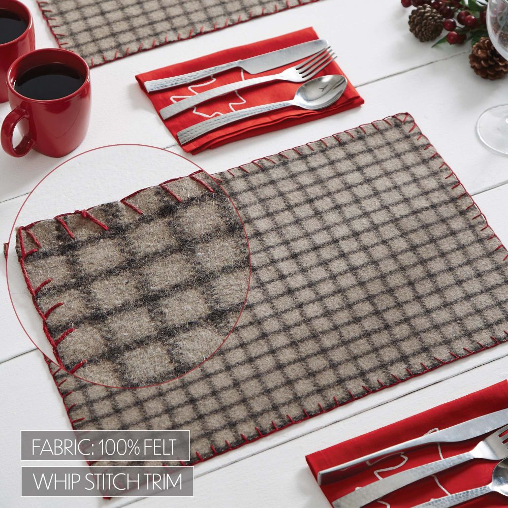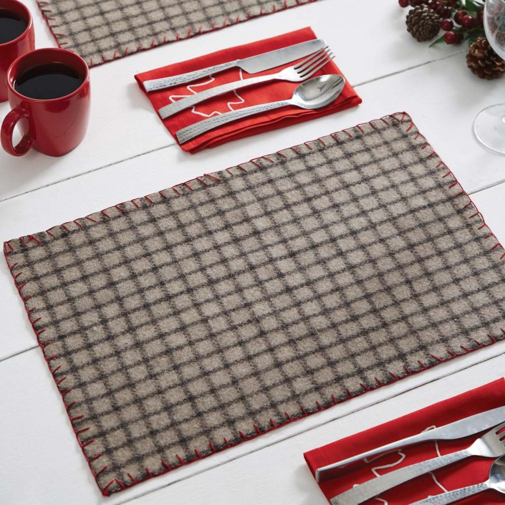Bring the Christmas farmhouse to your table with VHC Brand's Weston Christmas holiday 12x18" placemat set of 6. Each winter holiday placemat features slate grey and black windowpane felt for a rustic, hand-crafted style. Reverse your placemats for a quick turnover when needed. Get rustic chic with your holiday decor this season with VHC Brands entire holiday collection.