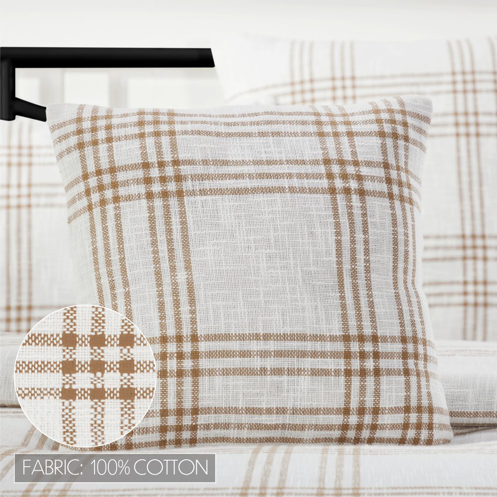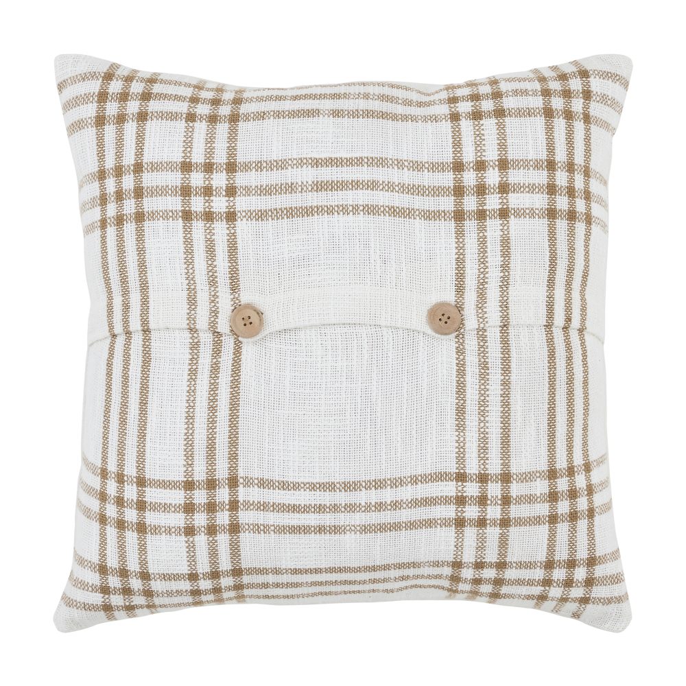 Add a pop of soft white and golden tan to your farmhouse home decor for effortless style year-round. The Wheat Plaid Fabric Pillow measures 18 by 18 inches and features a 100 percent cotton base in soft white with large-scale, golden striping for a simple, classic plaid look. Reverses to the same fabric with wooden button-style closures for easy cleaning. Machine washable and iron safe. Coordinates with the Wheat Plaid Collection by VHC for casual, timeless style. This square accent pillow adds a touch of modern country charm to your couch, sofa, entryway bench, bed or rocking chair.