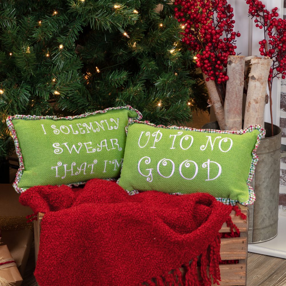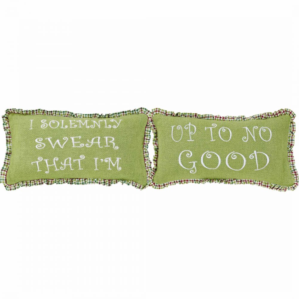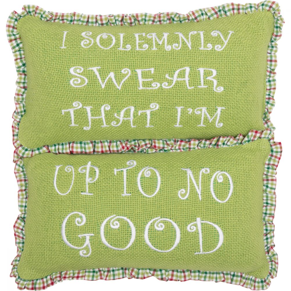 Feeling mischievous this holiday season? Show it off with VHC's Whimsical Christmas Up To No Good Throw Pillow set of 2. You'll get the crafty message of "I solemnly swear I'm up to no good" embroidered in white on the bright green burlap base. To mix it up, simply turn the Christmas pillows around for a fun candy-striped red green and white display. Gathered plaid trim provides rustic, old-fashioned feel you want for your farmhouse Christmas.