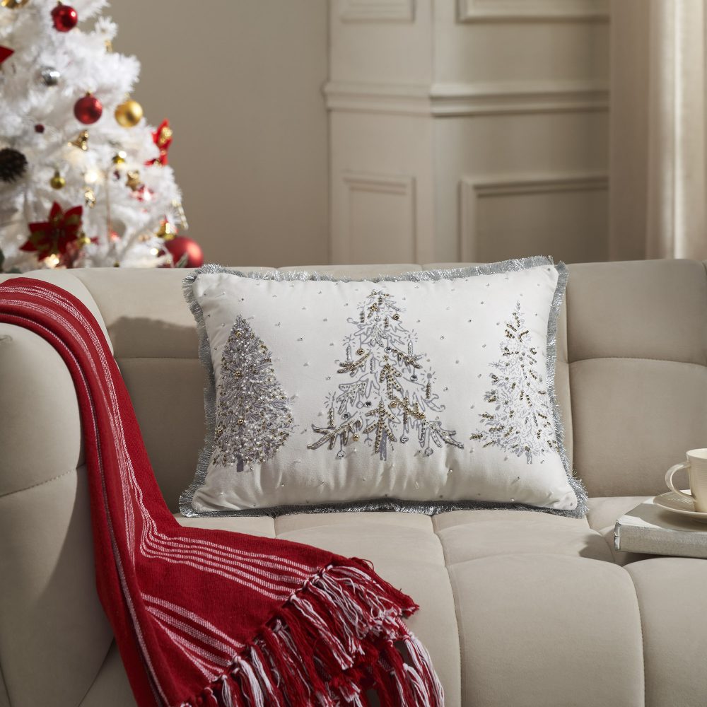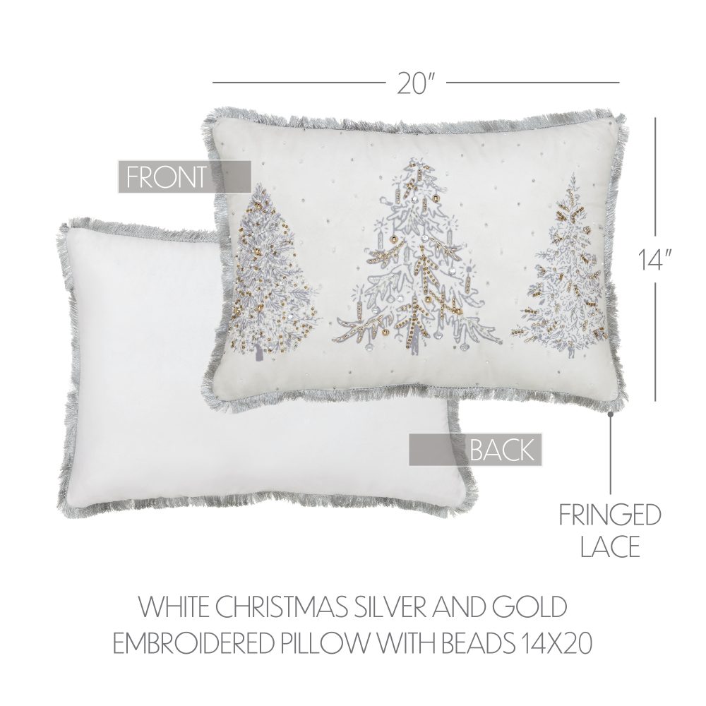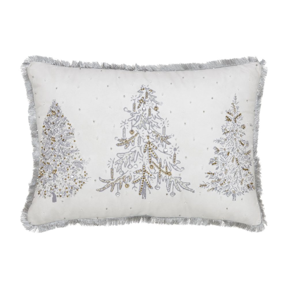 Add a touch of festive elegance to your home with the VHC Brands Christmas Embroidered Pillow with Beads. Designed for holiday charm, this 14x20 rectangular pillow features three beautifully printed Christmas trees in shimmering silver and gold. Each tree is delicately adorned with beaded accents, and tiny beads are scattered throughout the bright white background to create a subtle sparkle that catches the light. Crafted from soft polyester and finished with a refined silver fringe trim, this decorative pillow blends primitive rustic style with a hint of holiday glamour. The embroidered details and textured embellishments make it a standout accent in any Christmas decor arrangement. Whether placed on a couch, bench, or guest bed, it brings a warm and cheerful seasonal atmosphere to your space. Perfect for the bathroom, bedroom, dining room, entryway, kitchen, or living room, this pillow offers versatile placement across your home. Please note that it is intended for decorative use only and is not a toy-small parts may pose a choking hazard for children under 3. Spot clean as needed to maintain its festive beauty year after year.