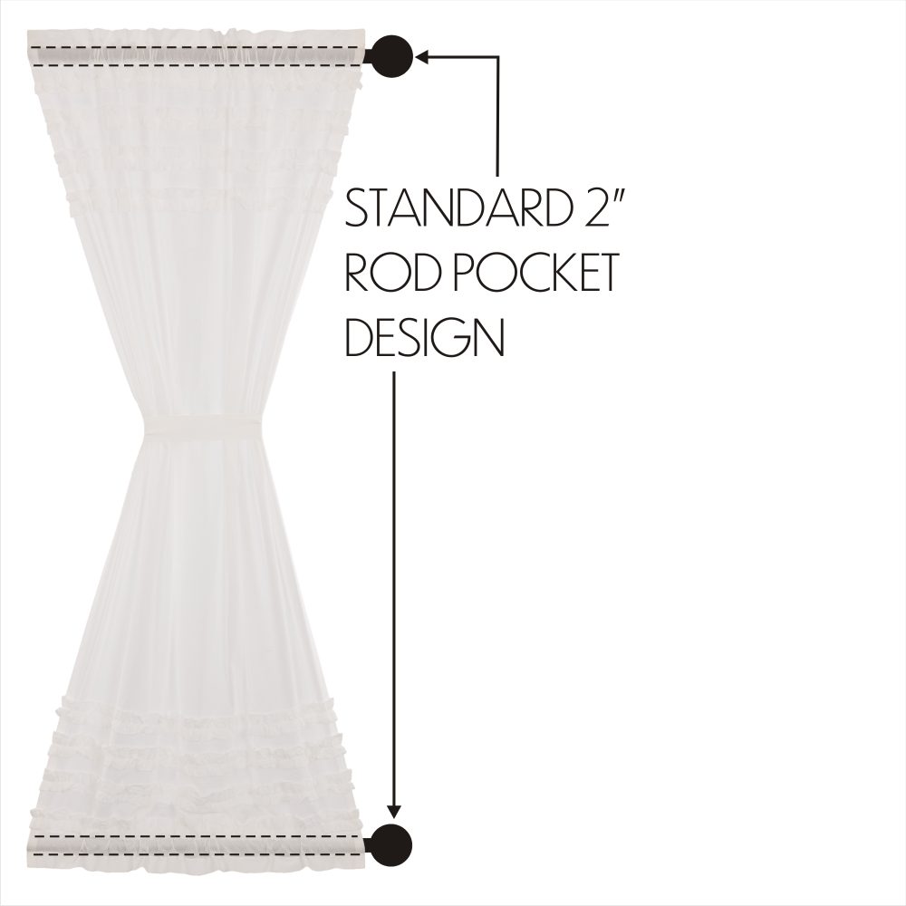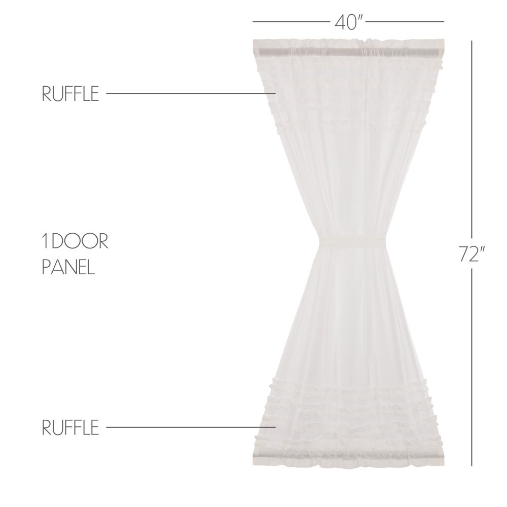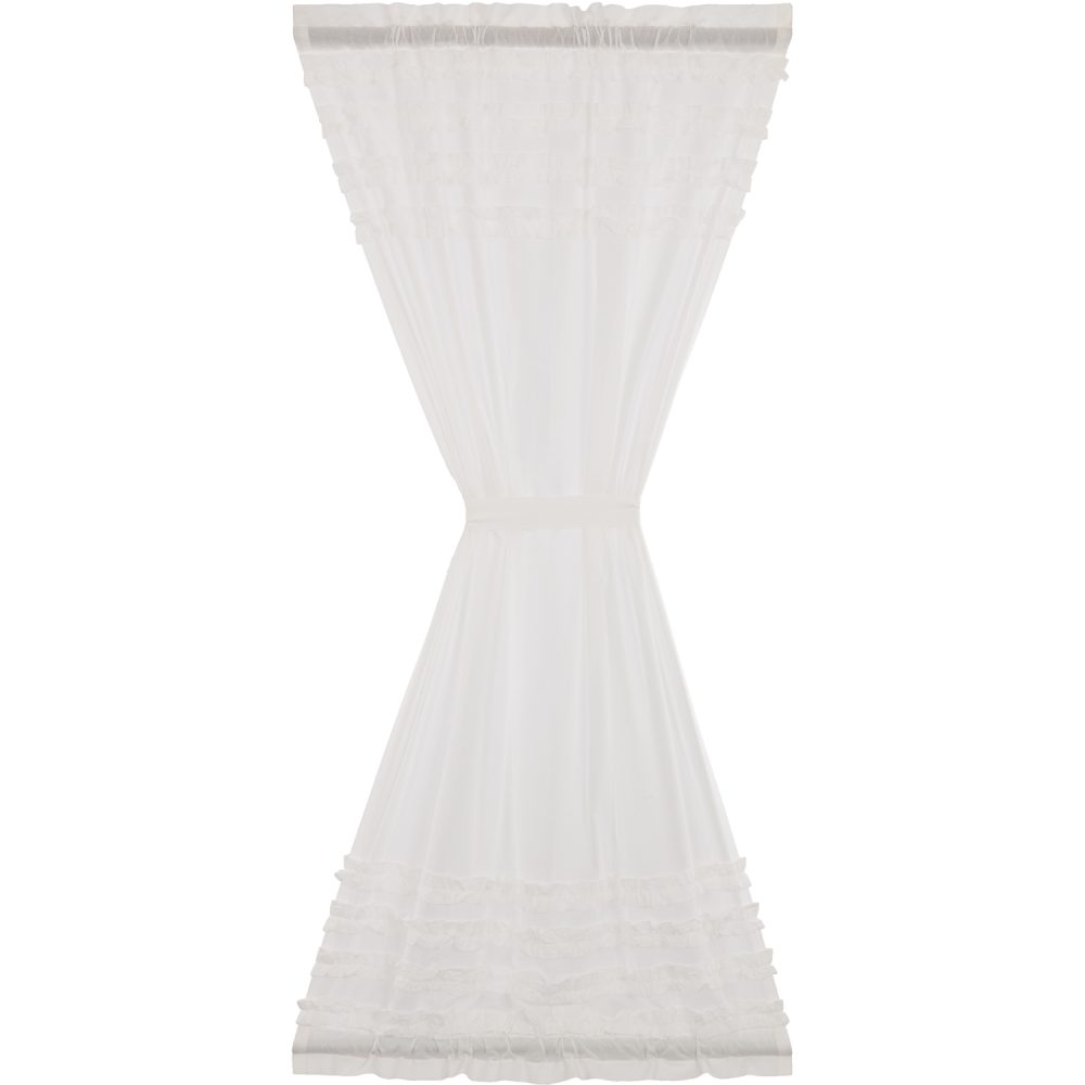 Sheer white cotton cambric with a ruched ruffle creates a simple, graceful look for your home. The White Ruffled Sheer Petticoat Door Panel 72x40 combines light and airy fabric with multi-tiered frills to create a perfect balance of sophistication and playfulness. The double-sided ruffles mimic those found on old-fashioned petticoats, giving a hint of country glamour that blends well with vintage and contemporary decor. Includes rod pockets for easy hanging and a matching tieback.