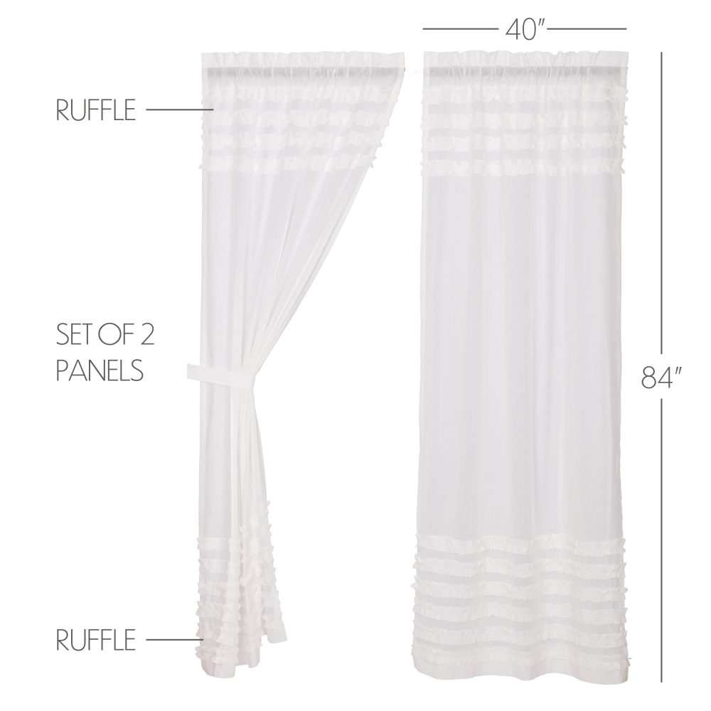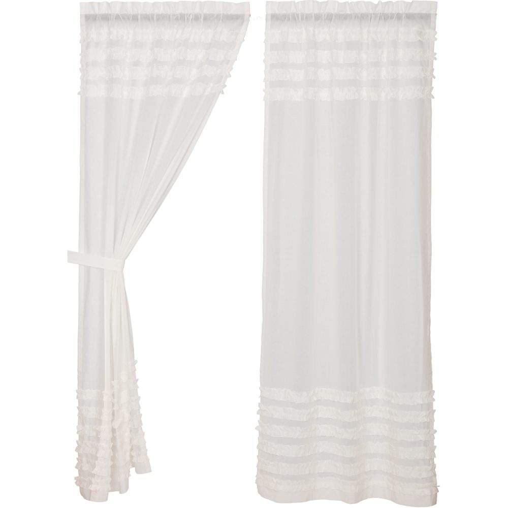 - RUFFLED FARMHOUSE CURTAINS: Includes two delicately ruffled 84 by 40 inch curtains crafted in a sheer, lightweight cambric made from 100% cotton. Features rod pocket for easy hanging and matching tie backs.