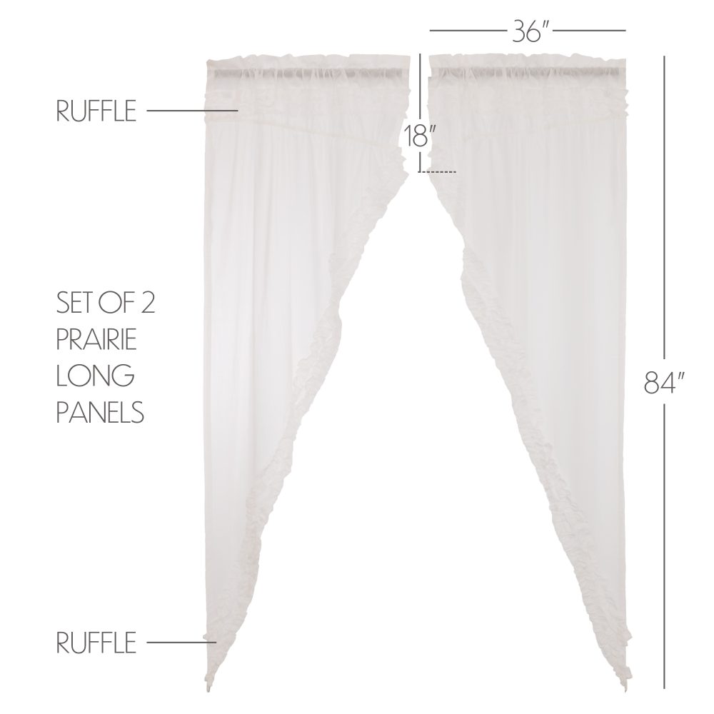 - RUFFLED PRAIRIE PANELS: Includes two 84 by 36 by 18 inch long prairie-style panels with adjustable drawstring ties to modify the look of your curtain set. Prairie curtains are a classic country style featuring long, angled drapes to frame your window while leaving a triangular space open for additional natural light.