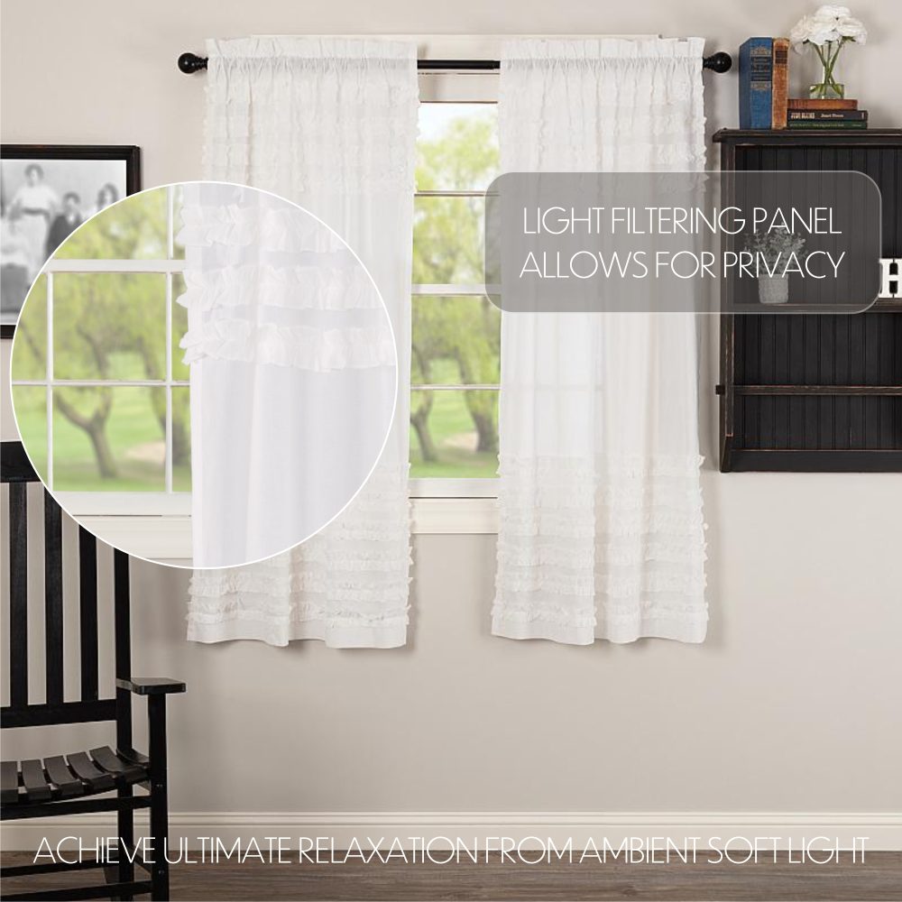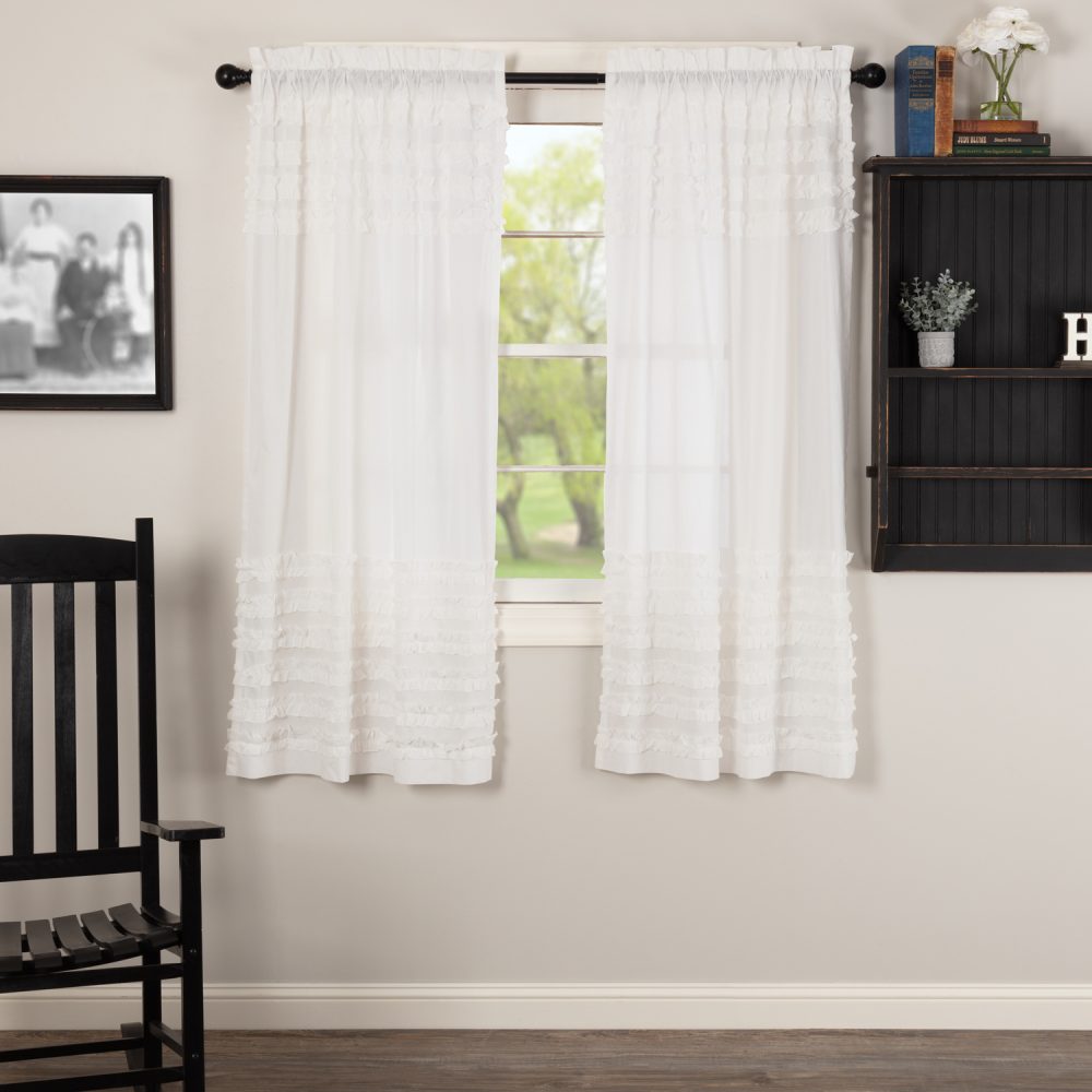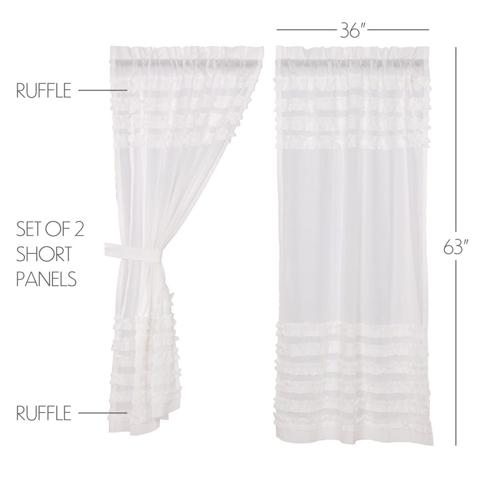 Add a graceful, feminine touch to your home with these delicately ruffled, sheer panels. The White Ruffled Sheer Petticoat Short Panel Set of 2 63x36 is made from a lightweight cambric and is delightfully detailed with ruched ruffles reminiscent of a classic cotton petticoat. Includes rod pocket for easy hanging and matching tie backs.