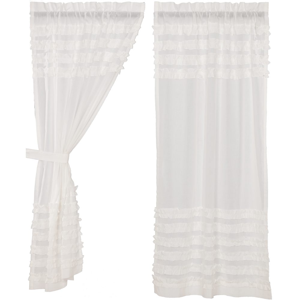 - RUFFLED FARMHOUSE CURTAINS: Includes two delicately ruffled 63 by 36 inch curtains crafted in a sheer, lightweight cambric made from 100% cotton. Features rod pocket for easy hanging and matching tie backs.