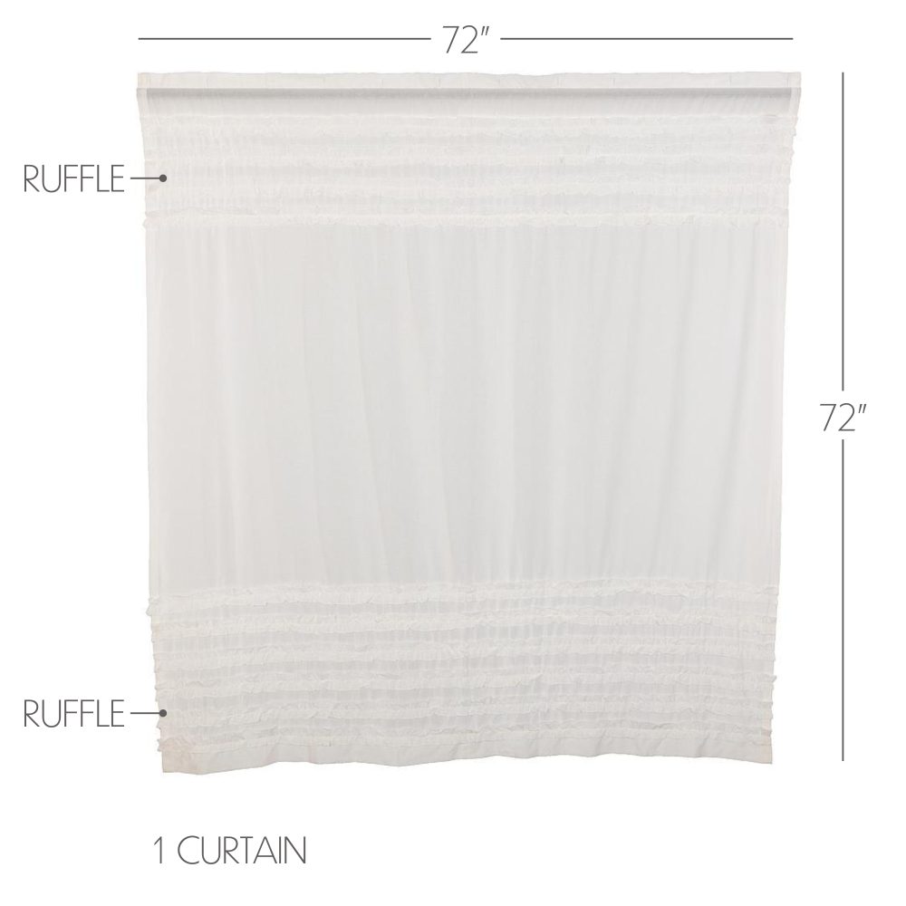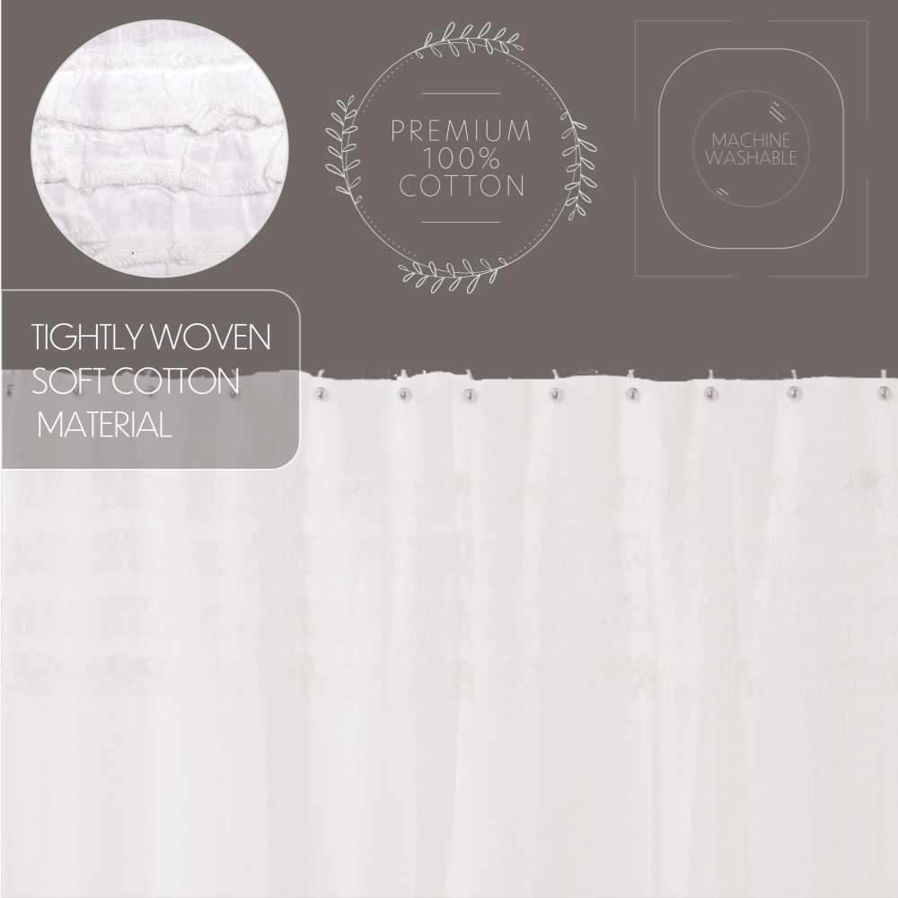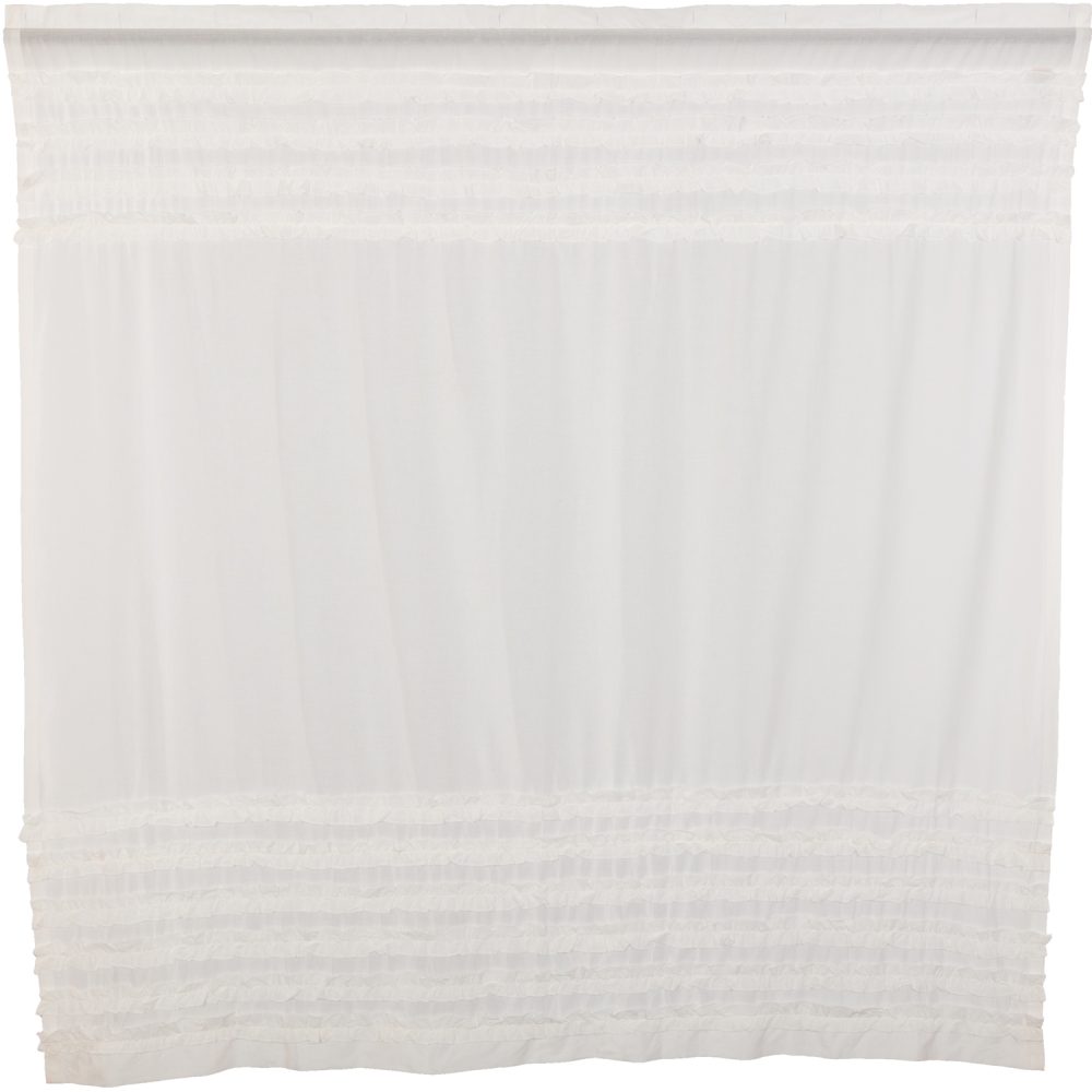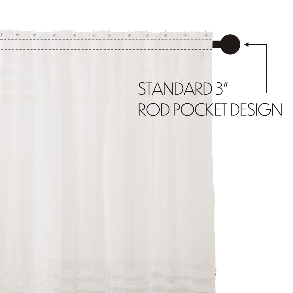 Create a simple, romantic farmhouse look for your bath. The White Ruffled Sheer Petticoat Shower Curtain features sheer pure white fabric with delicate ruched ruffles reminiscent of a classic petticoat. Measures 72 by 72 inches to fit standard sized showers and baths. Easily hang this classic country bath curtain with shower hooks of your choosing (not included) using the button holes attached. A 3" rod pocket is also available as an alternative hanging method.
