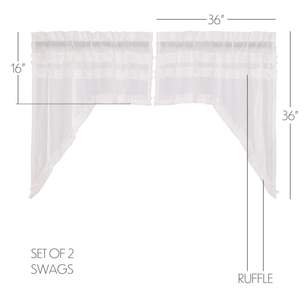 - RUFFLED FARMHOUSE SWAG: Includes two 36 by 36 by 16 inch swag panels. Swag curtains are a classic country style featuring angled draping to frame your window while leaving space open for additional natural light. Our swag curtains include a rod pocket for easy hanging.