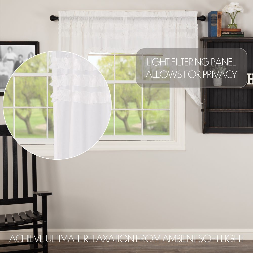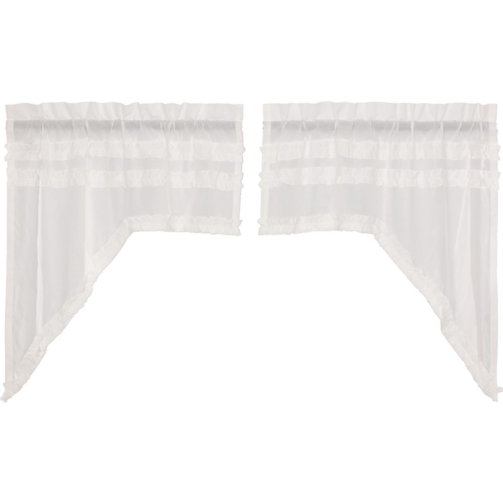 The White Ruffled Sheer Petticoat Swag Set adds graceful, feminine style to your home. Swag curtains are a classic country style featuring angled drapes to frame your window while leaving space open for additional natural light. Our curtains feature beautiful, sheer white cambric with delicate ruched ruffles for romantic cottage charm. Includes a rod pocket for easy hanging.