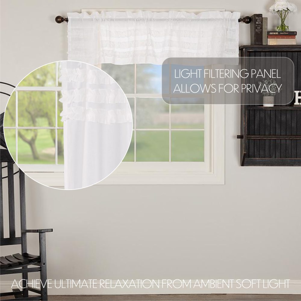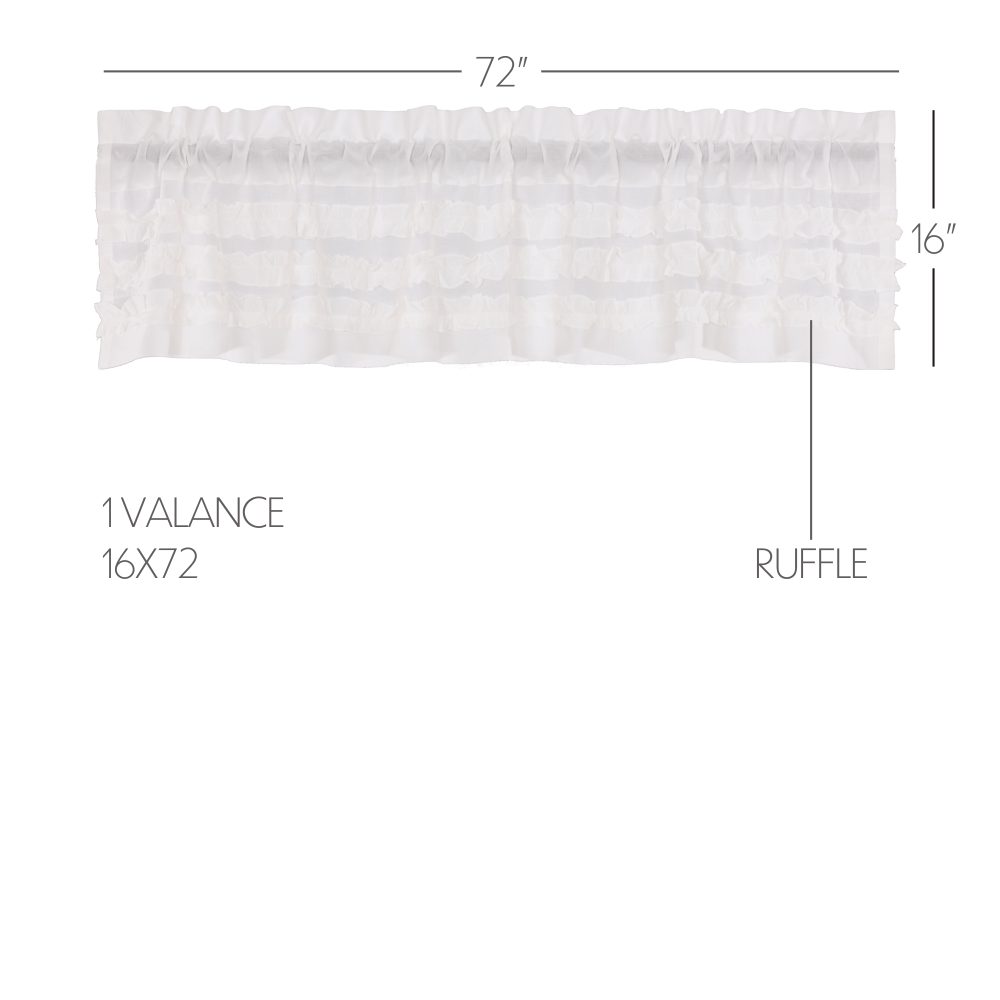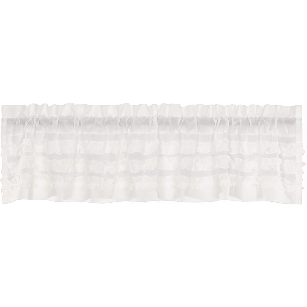 Sheer white cotton cambric with a ruched ruffle creates a simple, graceful look for your home. The White Ruffled Sheer Petticoat Valance 16x72 combines light and airy fabric with multi-tiered frills to create a perfect balance of sophistication and playfulness. The double-sided ruffles mimic those found on old-fashioned petticoats, giving a hint of country glamour that blends well with vintage and contemporary decor. Includes rod pocket for easy hanging.