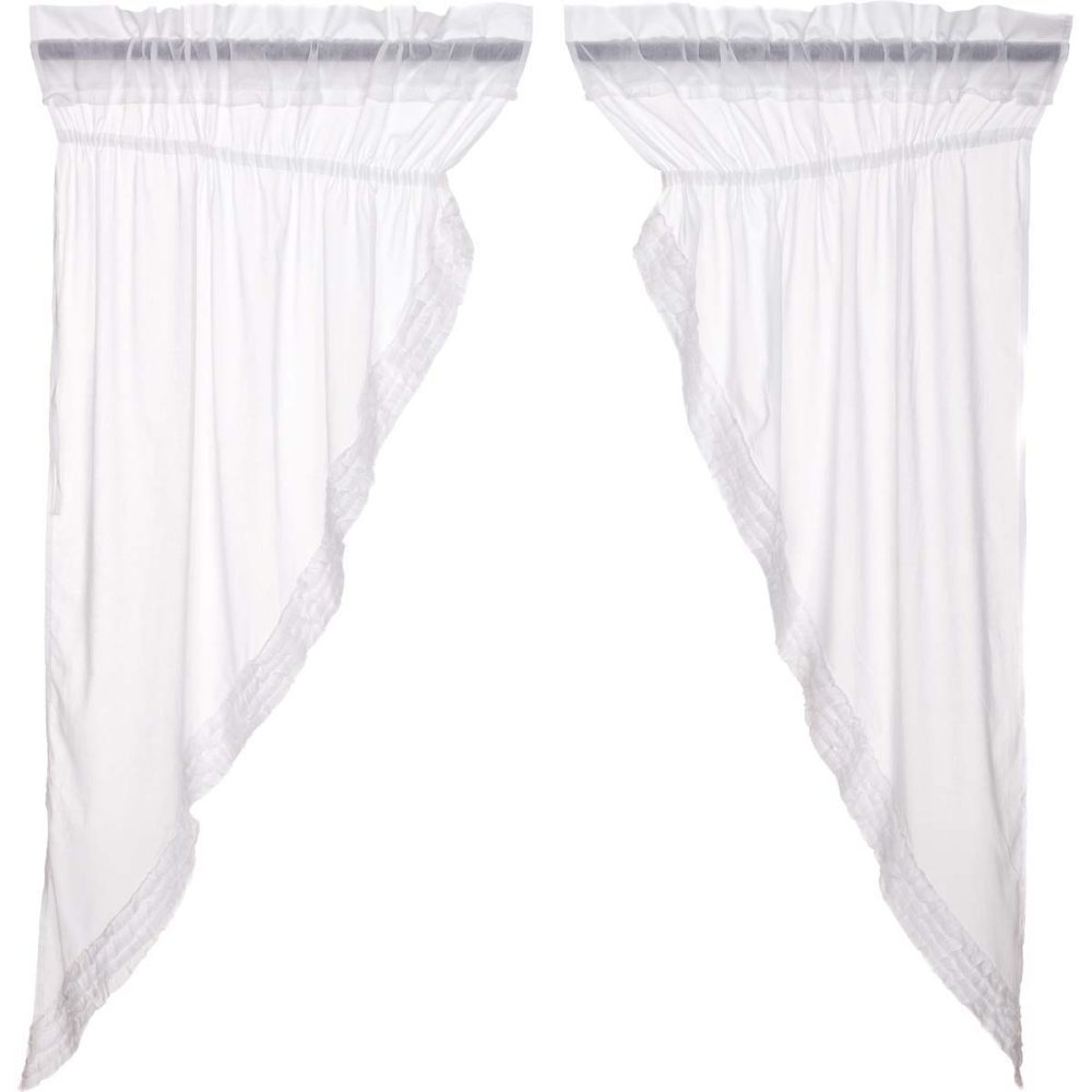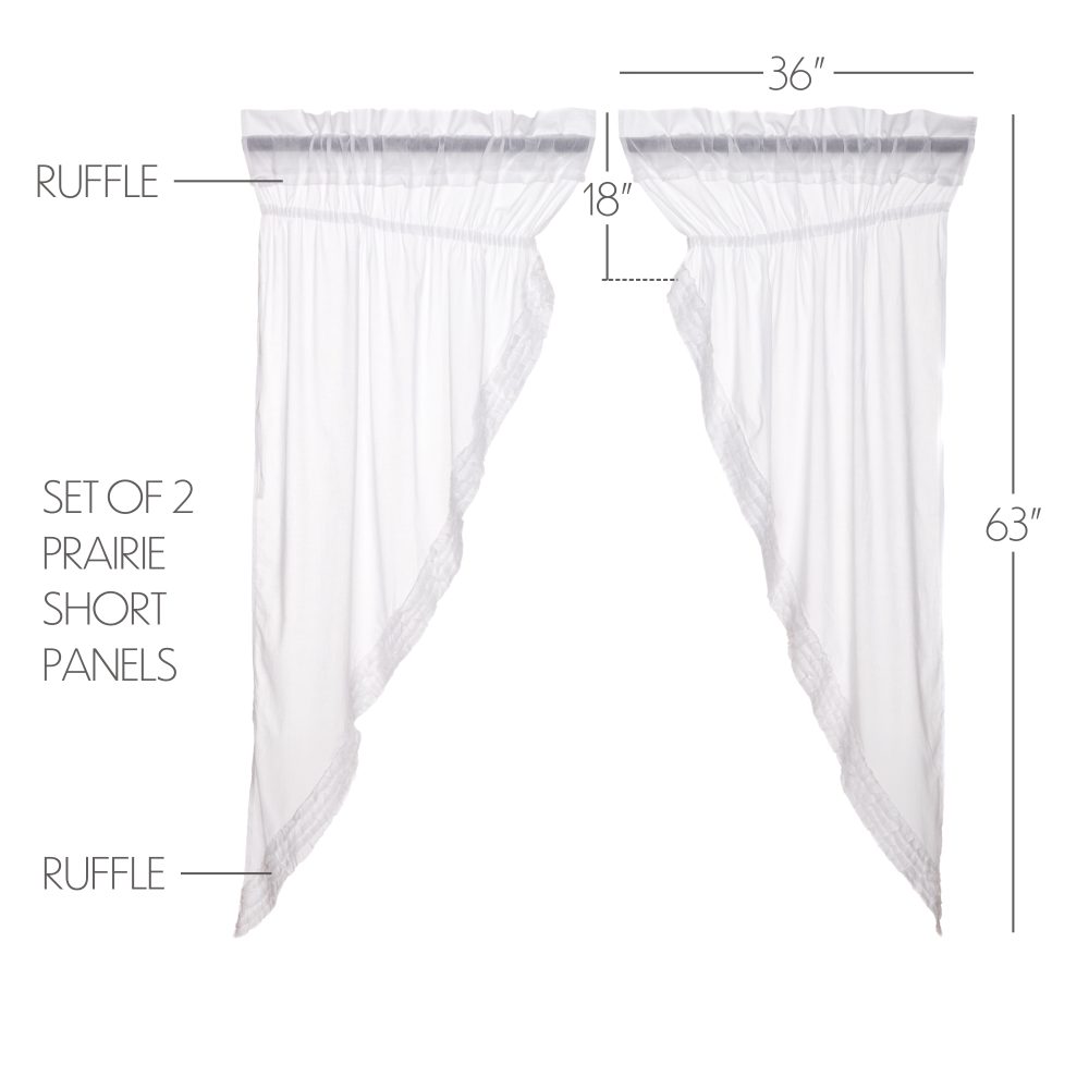 The White Ruffled Sheer Prairie Short Panel Set of 2 focuses on lightweight design. This 63x36x18 curtain's slightly transparent quality provides an airy feel throughout the home. The thin layer of ruffling adds a touch of vintage to the overall farmhouse look of our all-cotton window treatment set. These country curtains include drawstring ties for easy customization. Soft and classy, the impeccable workmanship and pleasing simplicity make a great choice for a variety of decor styles.