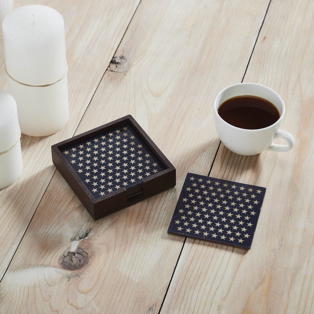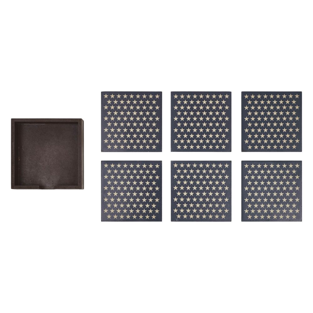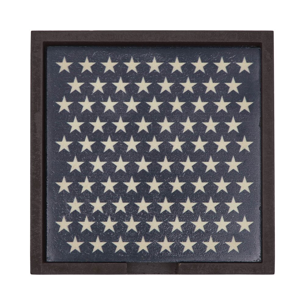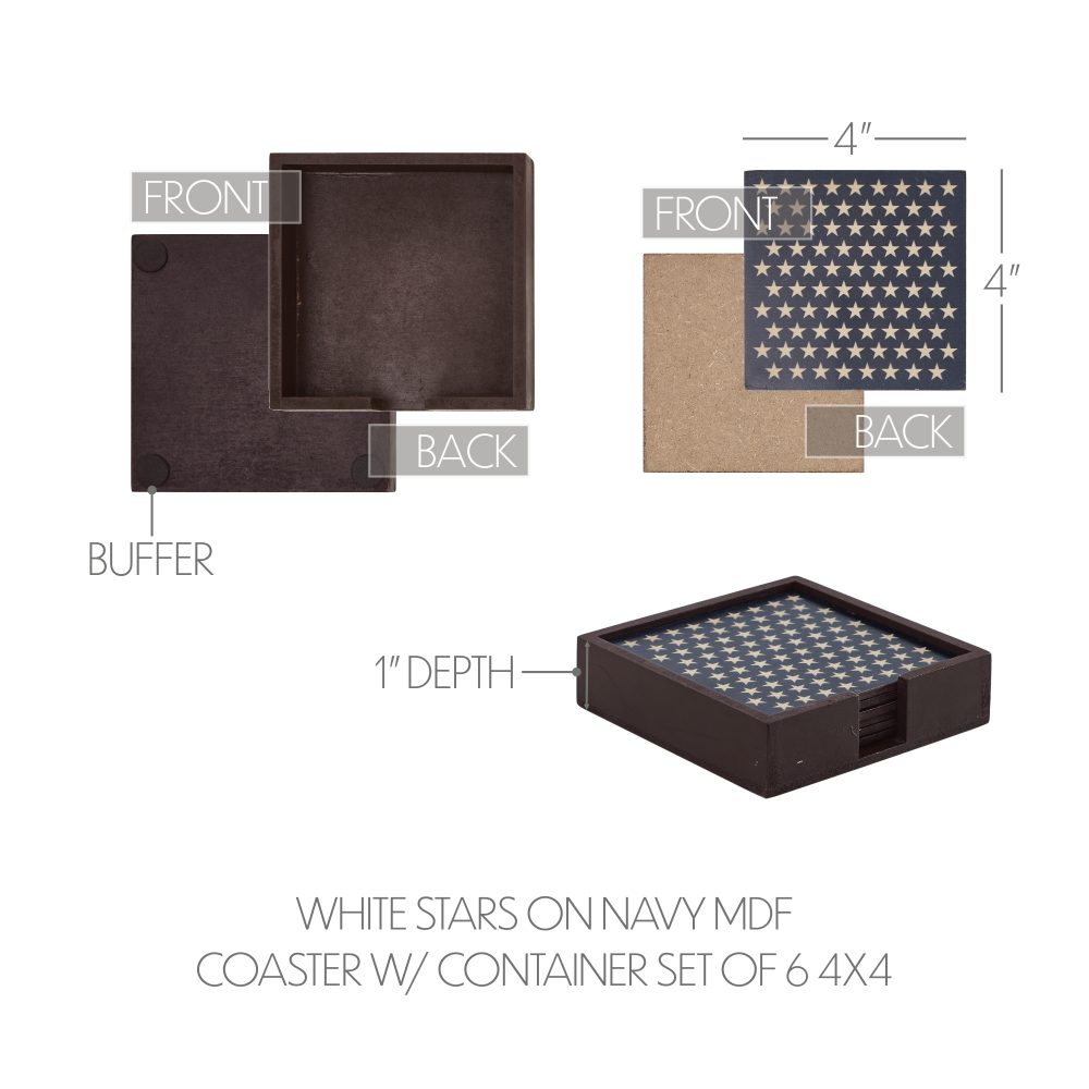 Add a touch of patriotic charm to your home with the VHC Brands Patriotic Stars On MDF Coaster w/ Container Set of 6. This beautifully designed set features six square coasters adorned with numerous 5-point creme stars on a rich navy blue base, capturing a timeless Americana style. The set comes with a matching container that neatly holds the coasters, featuring a convenient front opening for easy access. Perfect for Independence Day celebrations or year-round decor, these coasters are a practical yet stylish addition to your living room, dining room, or kitchen. Use them to protect surfaces while entertaining guests or simply as a decorative accent. Their rustic, country-inspired design pairs seamlessly with farmhouse and Americana-themed interiors, making them a versatile choice for any setting. Crafted from durable MDF and finished with a high-quality digital print, the VHC Brands Patriotic Stars On MDF Coaster Set is built to last. The coasters are easy to maintain with a simple wipe clean, ensuring they stay fresh and vibrant for years to come. Whether hosting a Fourth of July gathering or showcasing your patriotic spirit every day, this coaster set combines functionality and charm to elevate your home decor.