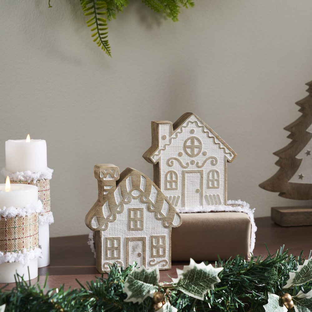 Bring festive charm and rustic warmth to your holiday decor with the VHC Brands Washed Candy Cane Lane Wooden Houses Set of 2. These delightful figurines feature cookie-cutout candy cane houses crafted from tropical wood and finished in a soft whitewash with light tan accents. Relief-cut details such as windows, doors, and decorative trim add depth and character, while the distressed high spots create a vintage, weathered look that contrasts beautifully against the white background. Perfect for adding handcrafted charm to your seasonal displays, this set of two houses complements farmhouse, primitive, or traditional Christmas themes. Each piece is designed to stand securely on mantels, shelves, or tabletops, offering versatile placement options for your holiday arrangements. The classic color palette and intricate detailing evoke the nostalgic spirit of Christmas, making them a cozy addition to any room. Ideal for use throughout your home-in the bathroom, bedroom, dining room, entryway, kitchen, or living room-these White Washed Candy Cane Lane Wooden Houses bring joyful elegance and festive warmth to any space. Durable and easy to maintain, simply wipe clean with a soft cloth to preserve their rustic beauty year after year. This charming set is a wonderful addition to your Christmas collection, capturing the magic of the season.