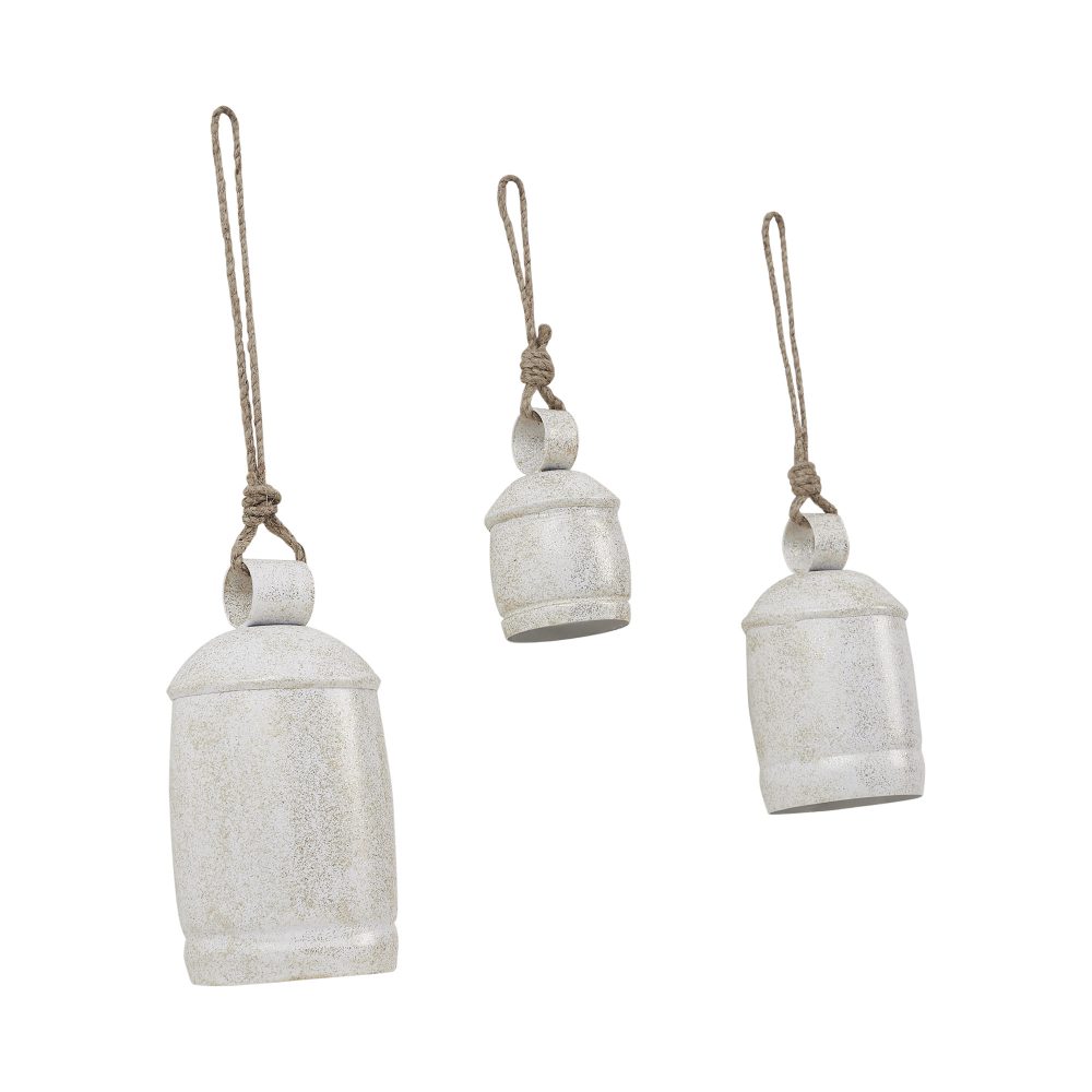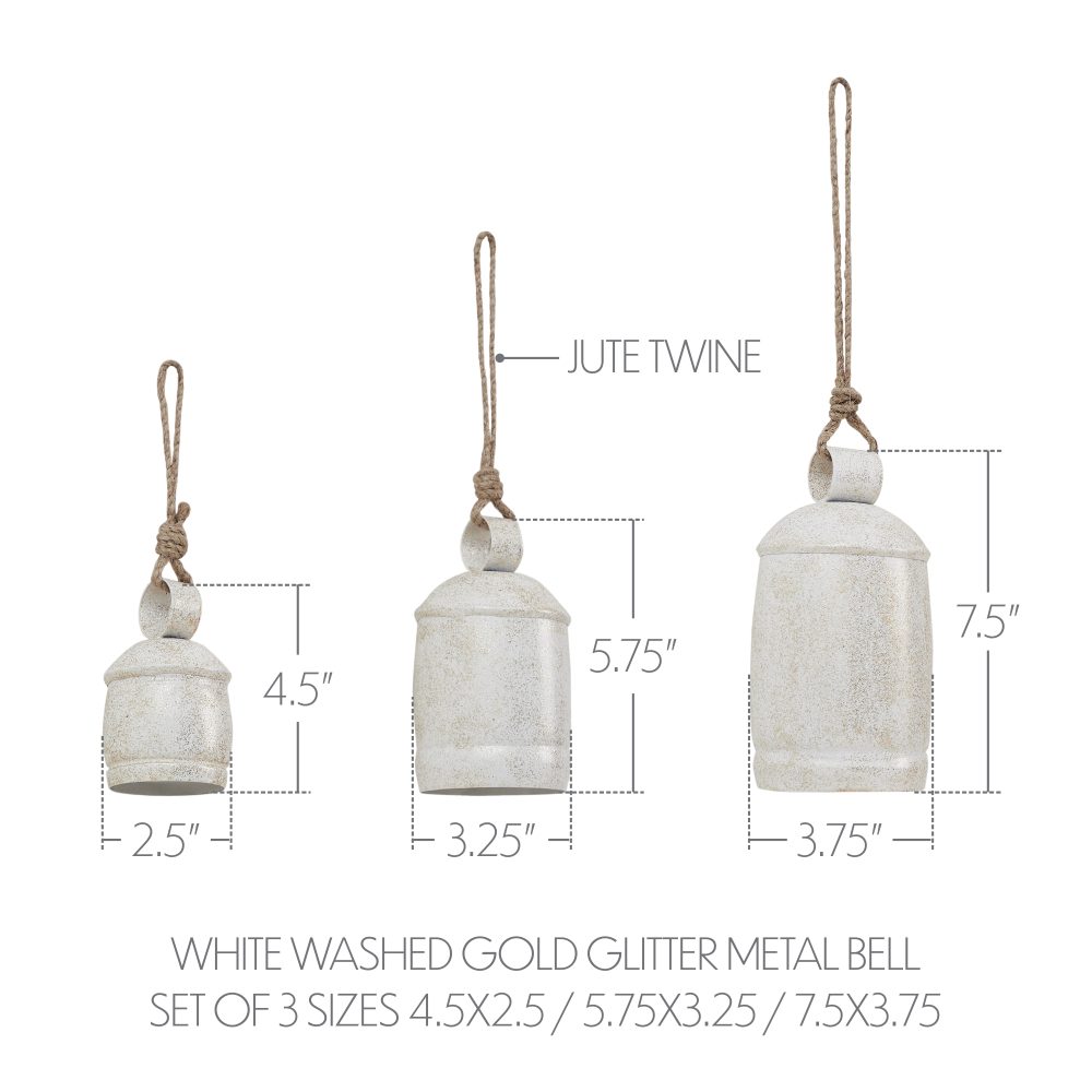 Add a touch of rustic elegance and festive shimmer to your holiday decor with the VHC Brands Washed Glitter Metal Bell Set of 3. This decorative trio includes three metal bells in varying sizes, each finished in a soft aged white wash and accented with dark gold glitter for a subtle sparkle. The jute rope hangers enhance their primitive, handcrafted charm, making them a perfect fit for country, vintage, or farmhouse-style Christmas themes. The distressed appearance and metallic highlights give these bells a weathered yet refined look, ideal for creating layered visual interest in your seasonal displays. Hang them on a tree, drape them from a mantel, or incorporate them into wreaths and garlands for a festive accent that blends warmth with elegance. Their varying sizes allow for creative arrangements throughout your space. Perfect for the bathroom, bedroom, dining room, entryway, kitchen, or living room, this set of three bells brings charm and texture to any corner of your home. Whether used together as a set or scattered for subtle accents, the Washed Glitter Metal Bell Set offers a timeless and festive addition to your holiday collection. To preserve their beauty, simply wipe clean with a soft cloth.