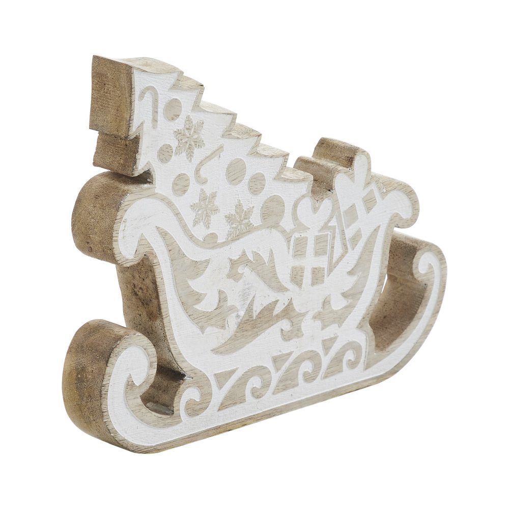 - Santa Sleigh Design: Features a charming cutout of Santa’s sleigh filled with relief cut toys and a Christmas tree, adding a festive and rustic touch to your Christmas and winter decor.