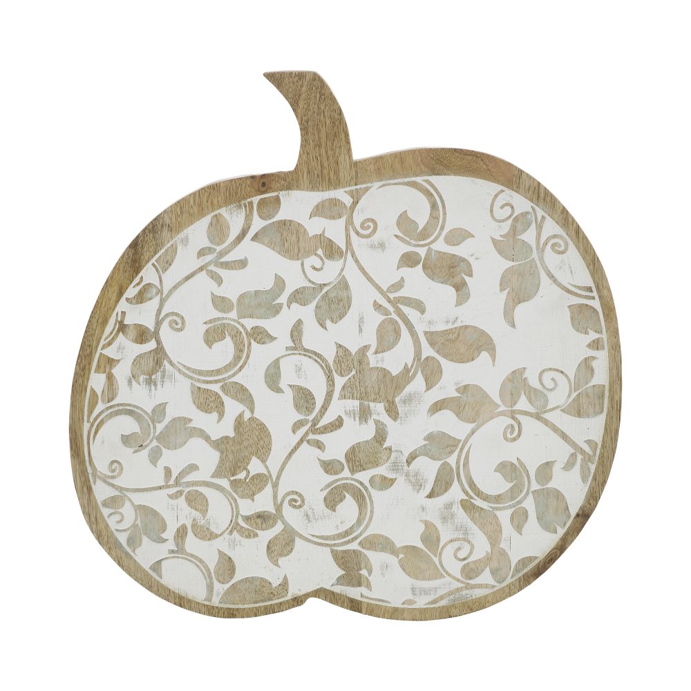 • HAND-CARVED PERFECTION: Meticulously crafted from durable tropical wood, this exquisite 14x14x1.5-inch White Wash Wooden Carved Vine Pumpkin features an intricate hand-carved trailing vine design rising in graceful relief, complemented by a soft whitewashed finish with a charming sanded, distressed character that reveals natural wood brown tones and authentic grain, delivering a timeless farmhouse aesthetic for fall harvest tabletop decor.