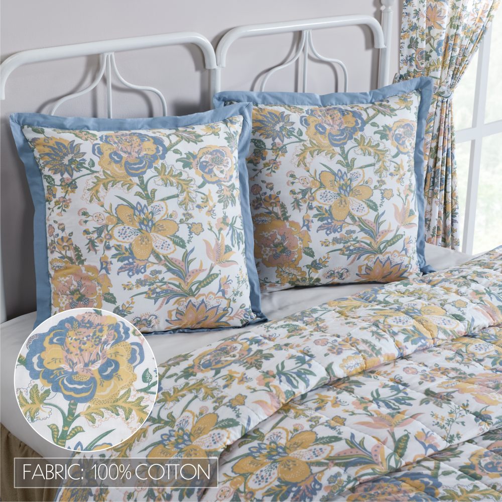 - FARMHOUSE EURO SHAM: Includes one 26 by 26 inch Euro Sham made from 100 percent cotton featuring floral front, flanged edging and tie-style closures. Reverse in dusty blue.