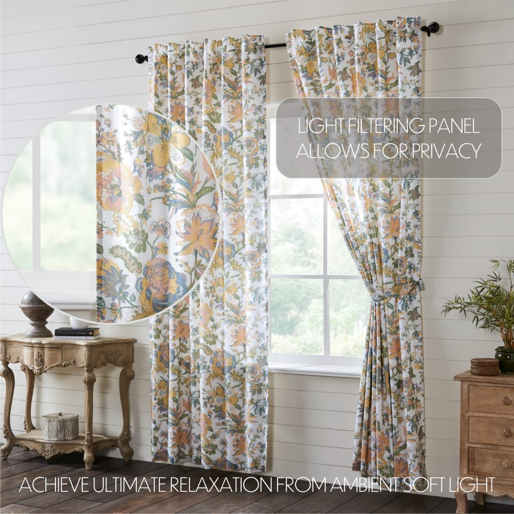 Vintage-inspired floral fabric in antique creme, soft green, and blue. The Wilder Panel Set of 2 96x50 is a wonderful addition to any feminine vintage country or cottage decor. Features a soft, cotton lining to prevent fading and additional privacy while a rod pocket and loops provide easy hanging options. Includes matching tie backs.