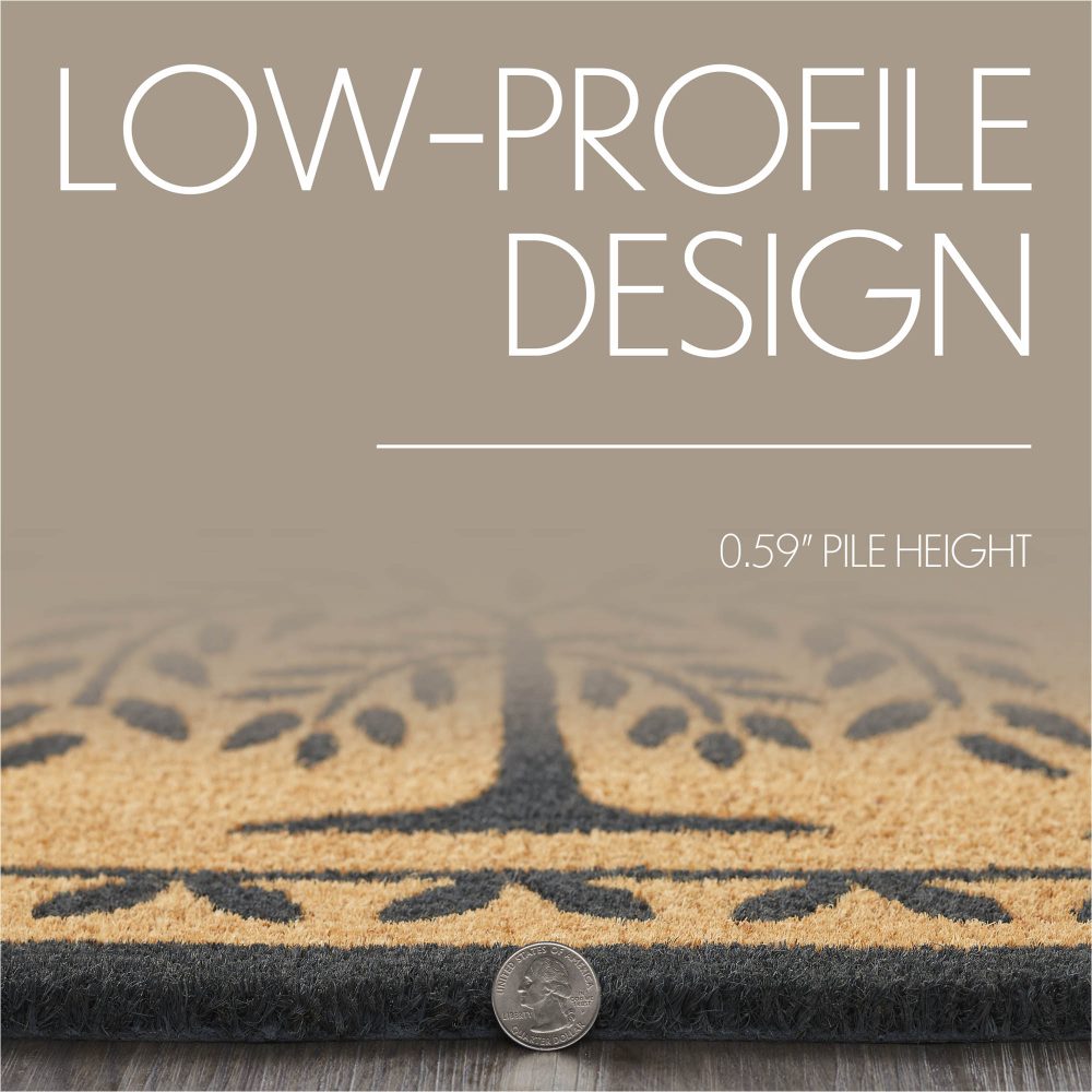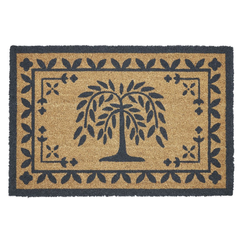 Welcome guests with the rustic elegance of the VHC Brands Willow Tree Coir Welcome Rug Rect 20x30. This beautifully designed doormat features a vintage willow tree silhouette, encircled by a detailed mosaic and leaf border in dark grey. Set against a warm natural tan background, it adds a touch of nature-inspired charm that enhances any entryway, making it a perfect fit for homes with a primitive or rustic aesthetic. Crafted from durable coir, this rug is ideal for high-traffic areas, effectively trapping dirt and debris to help keep your entryway clean and inviting. The rectangular shape fits snugly at your doorstep, while the non-slip PVC backing ensures that the rug stays securely in place, providing stability and safety for your guests. The intricate design creates a welcoming atmosphere that resonates with warmth and tranquility. For easy maintenance, simply shake or vacuum the rug to remove surface dirt. To prolong its vibrant colors and extend its lifespan, it's best to keep the VHC Brands Willow Tree Coir Welcome Rug in a sheltered entryway. Combining practical functionality with artistic charm, this rug is an essential addition to any home looking to offer a warm and inviting entrance.