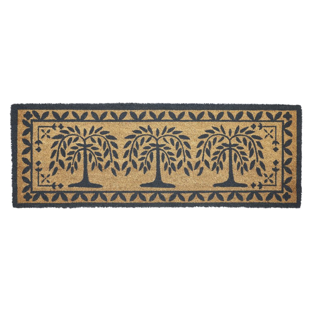 Welcome guests with the rustic elegance of the VHC Brands Willow Trees Coir Welcome Rug Rect 17x48. This beautifully designed doormat features a striking silhouette of a vintage willow tree, encircled by an intricate mosaic and leaf border in dark grey. Set against a natural tan background, this rug adds a touch of nature-inspired charm to your entryway, making it a perfect fit for any primitive or rustic-style home. Crafted from durable coir, this rug effectively traps dirt and debris, helping to keep your entryway clean and welcoming. The rectangular shape fits perfectly at your doorstep, while the non-slip PVC backing ensures stability, preventing slips and keeping the mat securely in place, even in high-traffic areas. The elegant design and welcoming text create a cozy atmosphere that invites family and friends into your home. For easy maintenance, simply shake or vacuum the rug to remove surface dirt. To prolong its vibrant colors and extend its lifespan, it's best to keep the VHC Brands Willow Trees Coir Welcome Rug in a sheltered entryway. Combining practicality with rustic beauty, this rug is an essential addition to any home looking to offer a warm and inviting entrance.