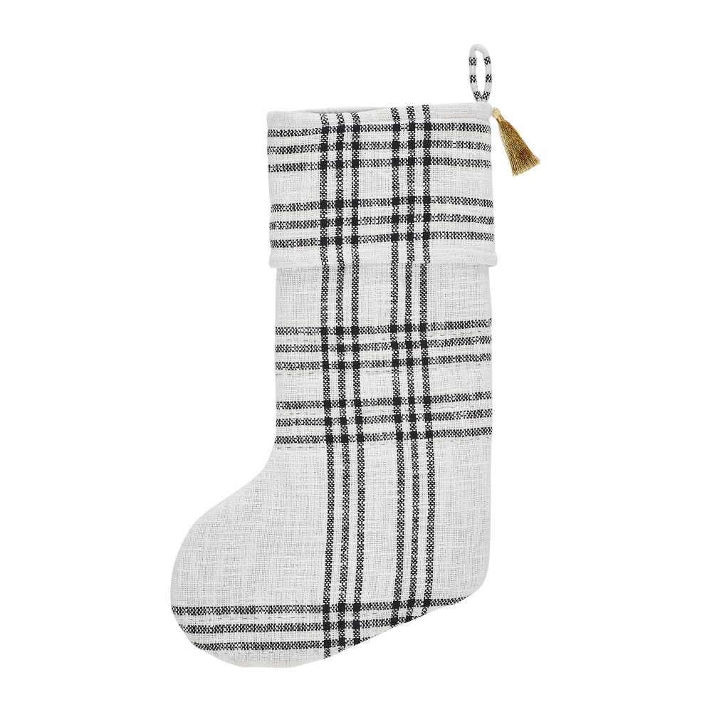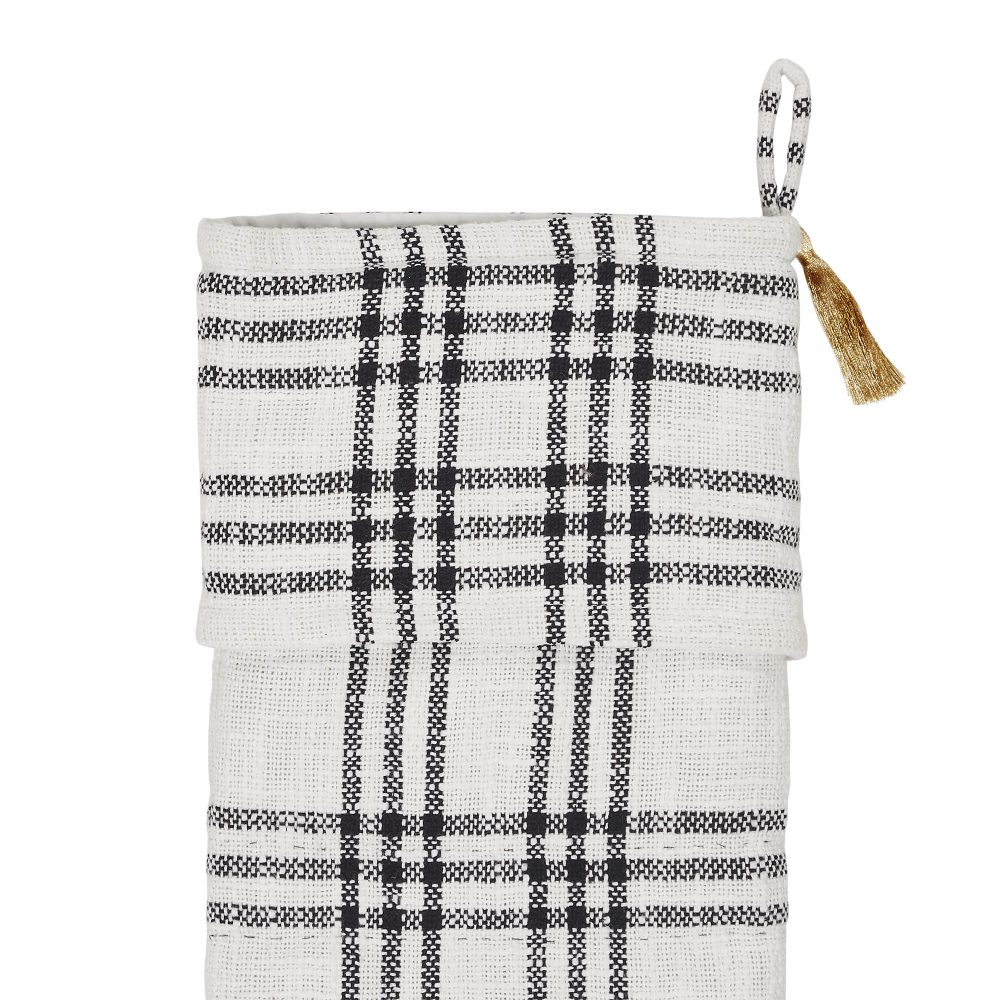 Craft the perfect elegant, minimalist Christmas look with this simple yet elegant stocking. The Wintergleam Black White Plaid Stocking features a white and black plaid base for a simple, traditional look. A coordinating cuff in matching fabric includes a gold tassel accent and a simple hanging loop. Coordinates with the Wintergleam Collection by VHC for modern farmhouse inspired style for your Christmas decor.
