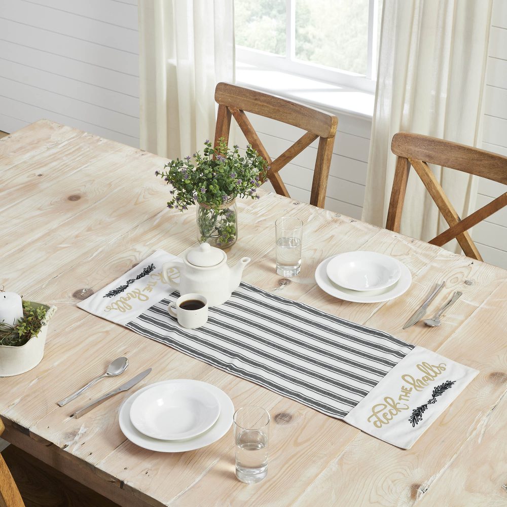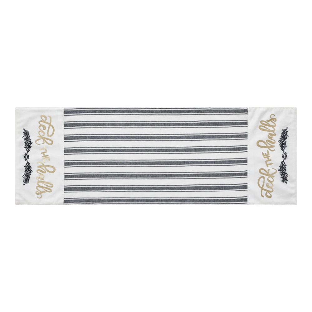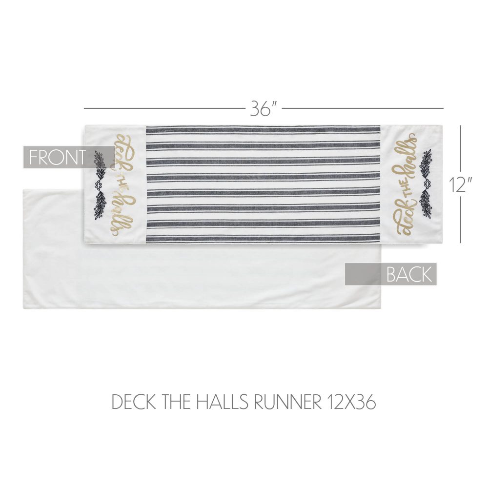 Craft a bold and festive table this season with an elegant black and white holiday table runner with gold foil accents. The Wintergleam Table Runner measures 12x36 inches and is made with 100 percent cotton. A simple grainsack stripe forms the center of the runner with accents on each end featuring a traditional holly berry print below gold foil lettering reading, Deck the Halls. Coordinates with the Wintergleam Collection by VHC for bold and elegant Christmas style for the entire home.